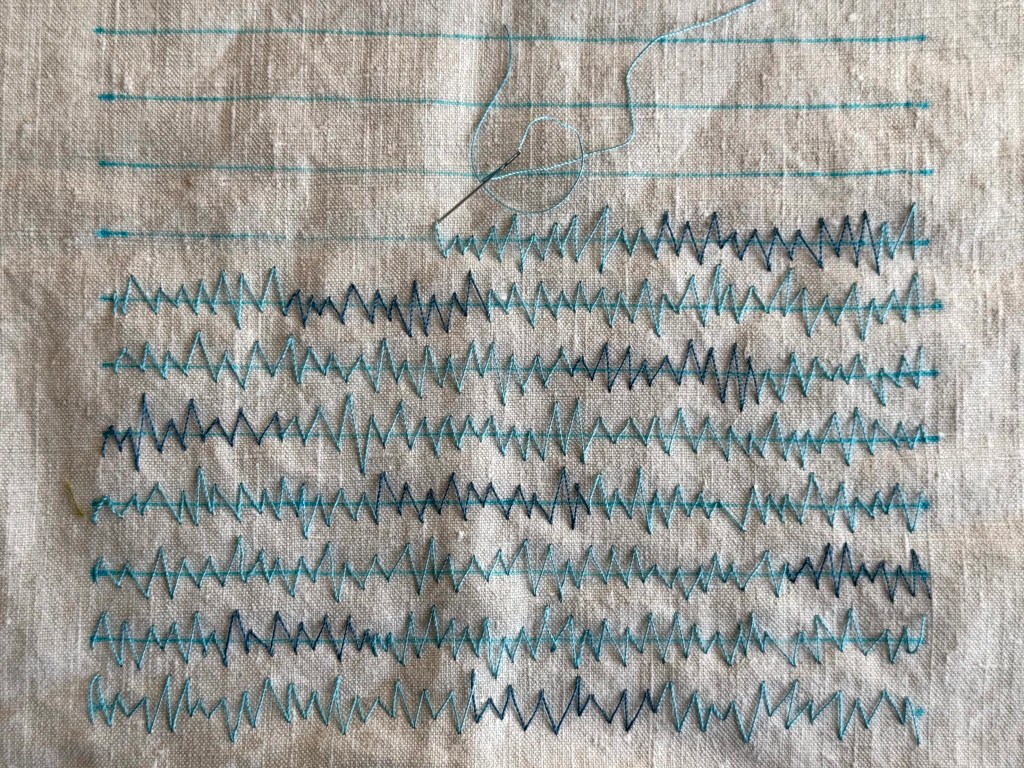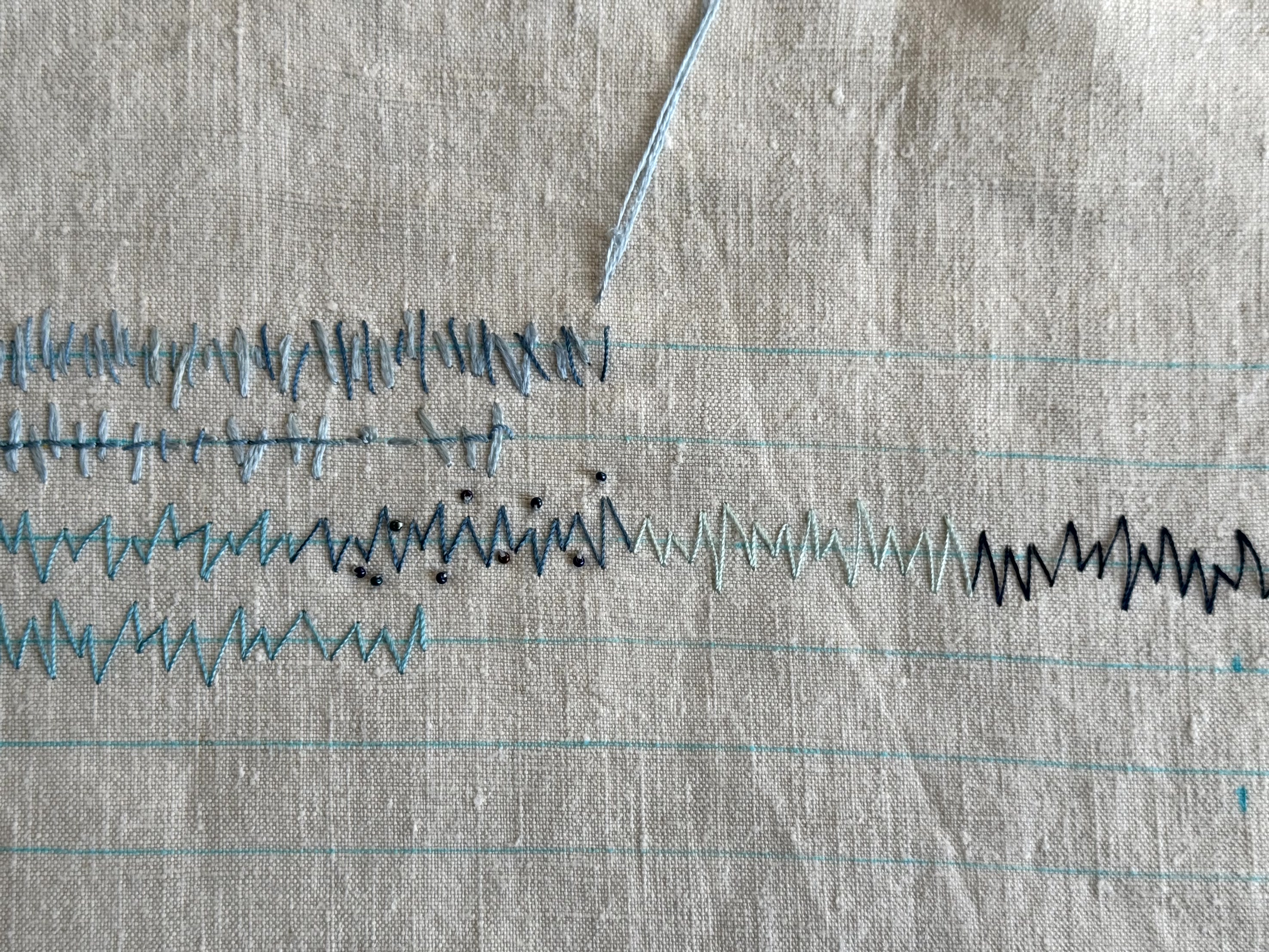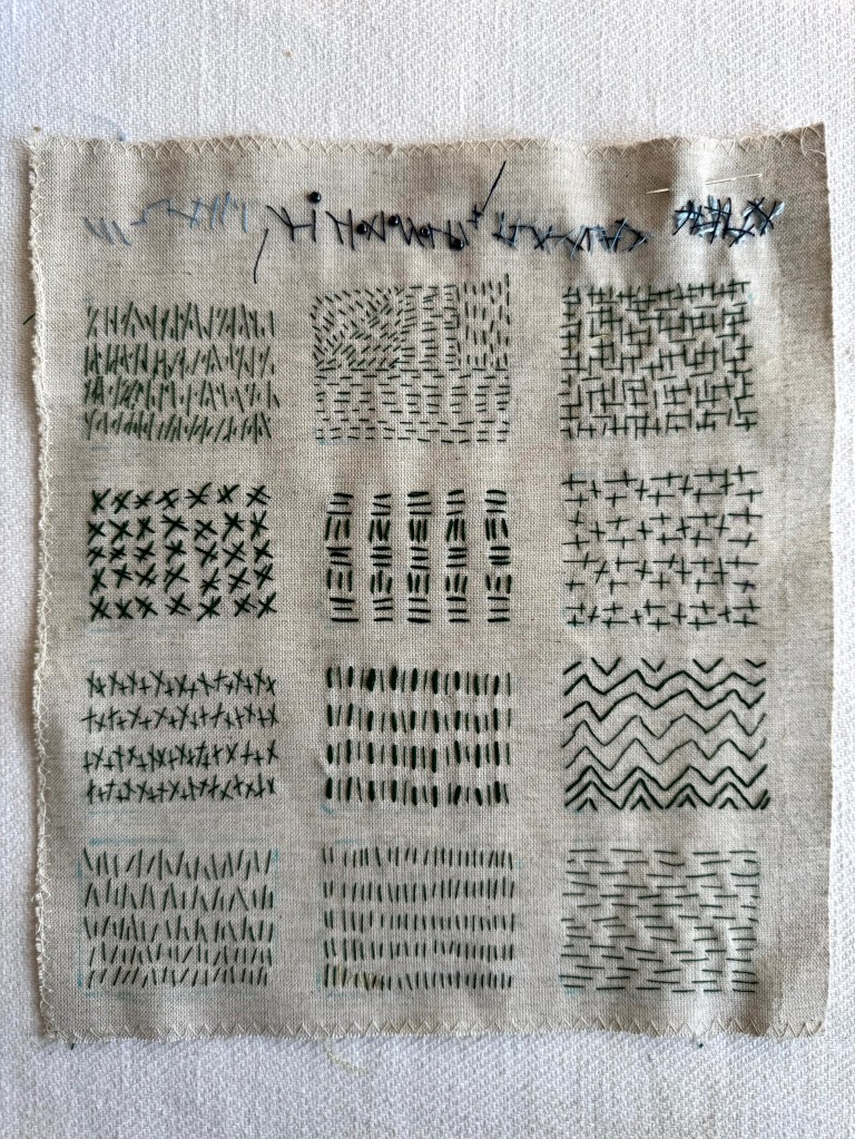 Ik experimenteerde met de rijgsteek, platsteek en stiksteek in verschillende diktes garen.