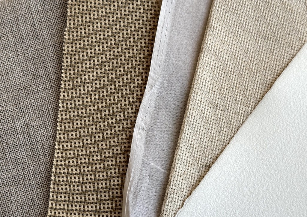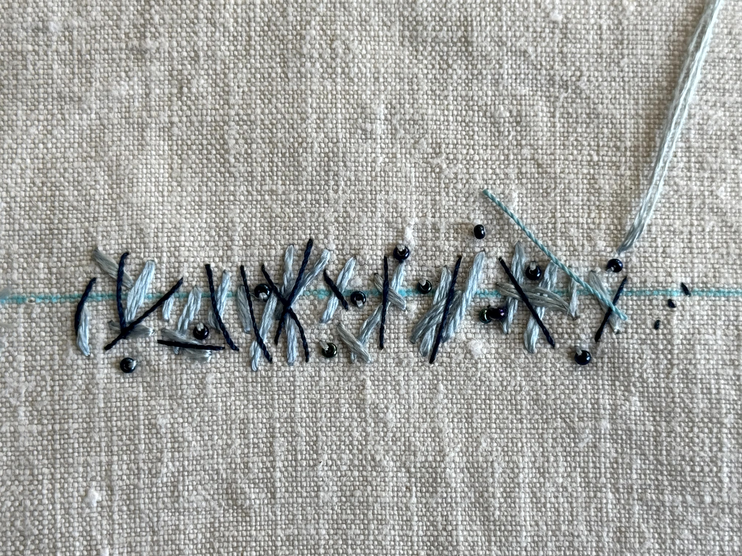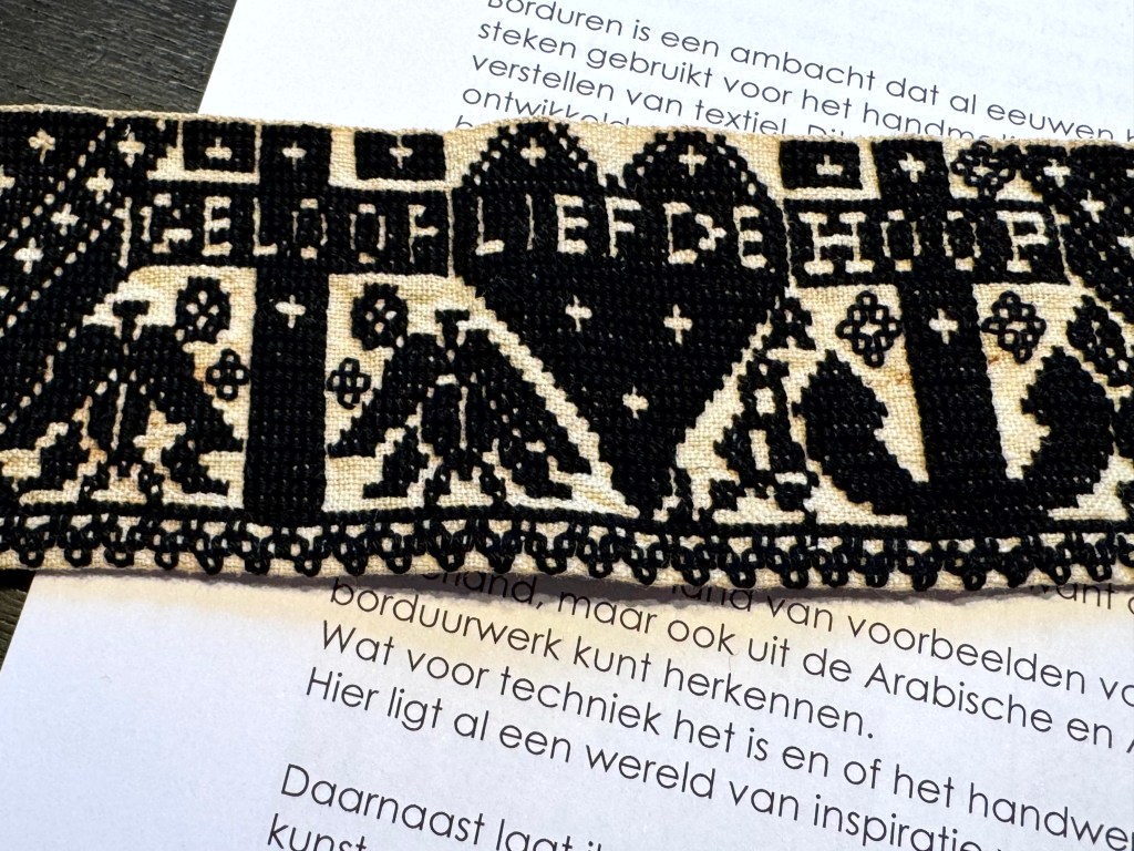 Een lap oud Frans linnen als basis en daarop kwamen regels, een soort geheimschrift van garen.