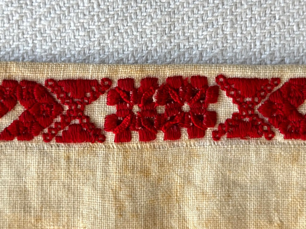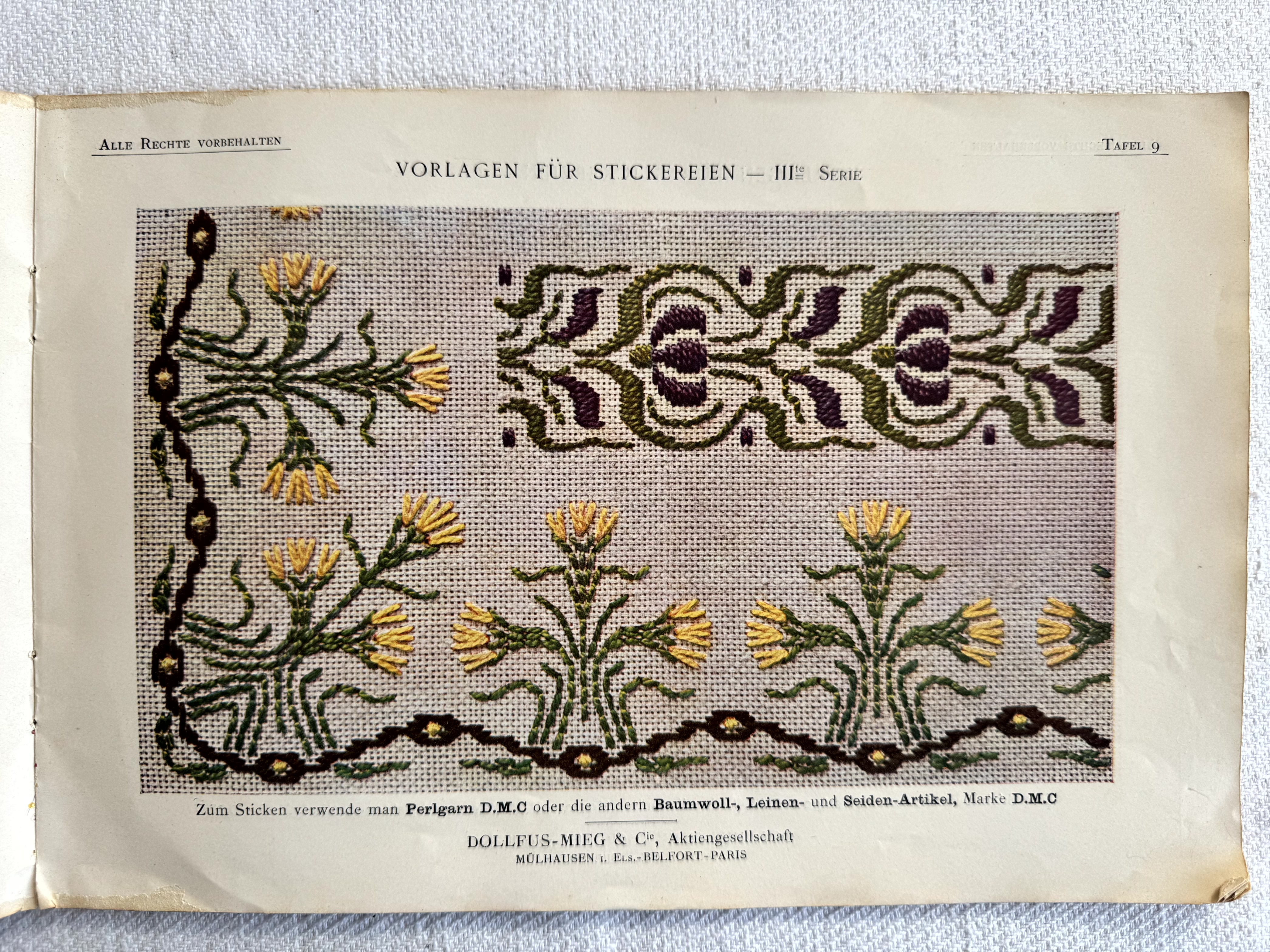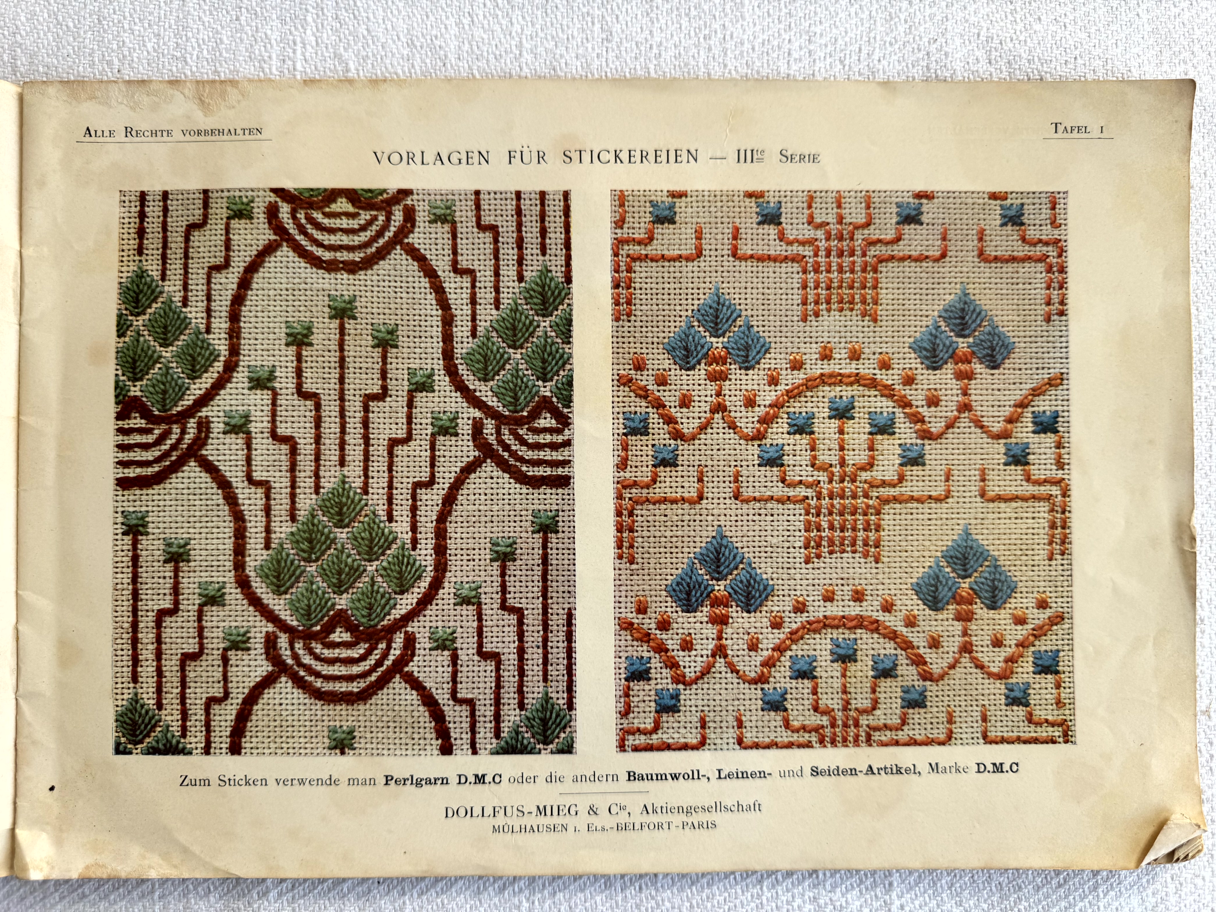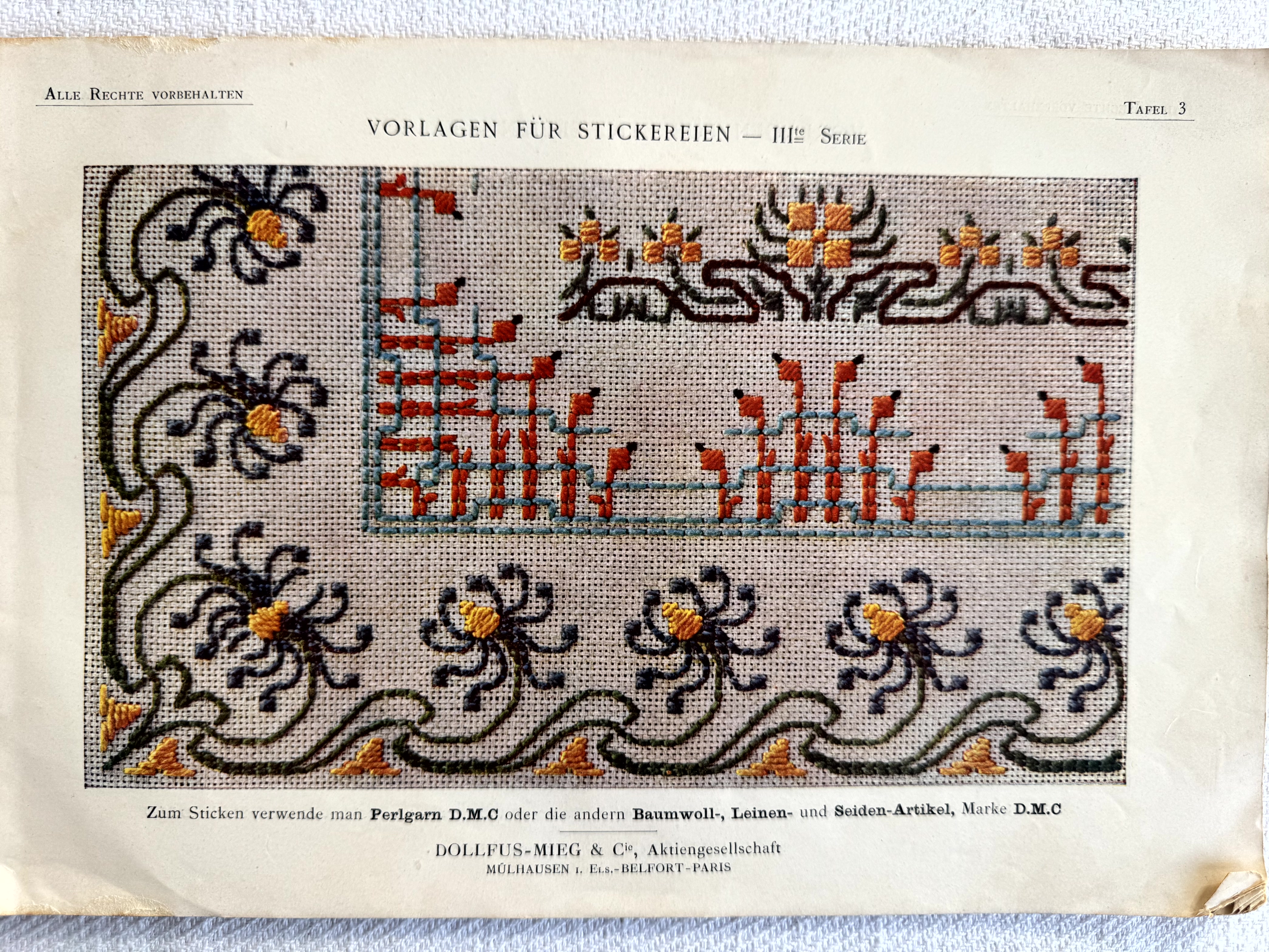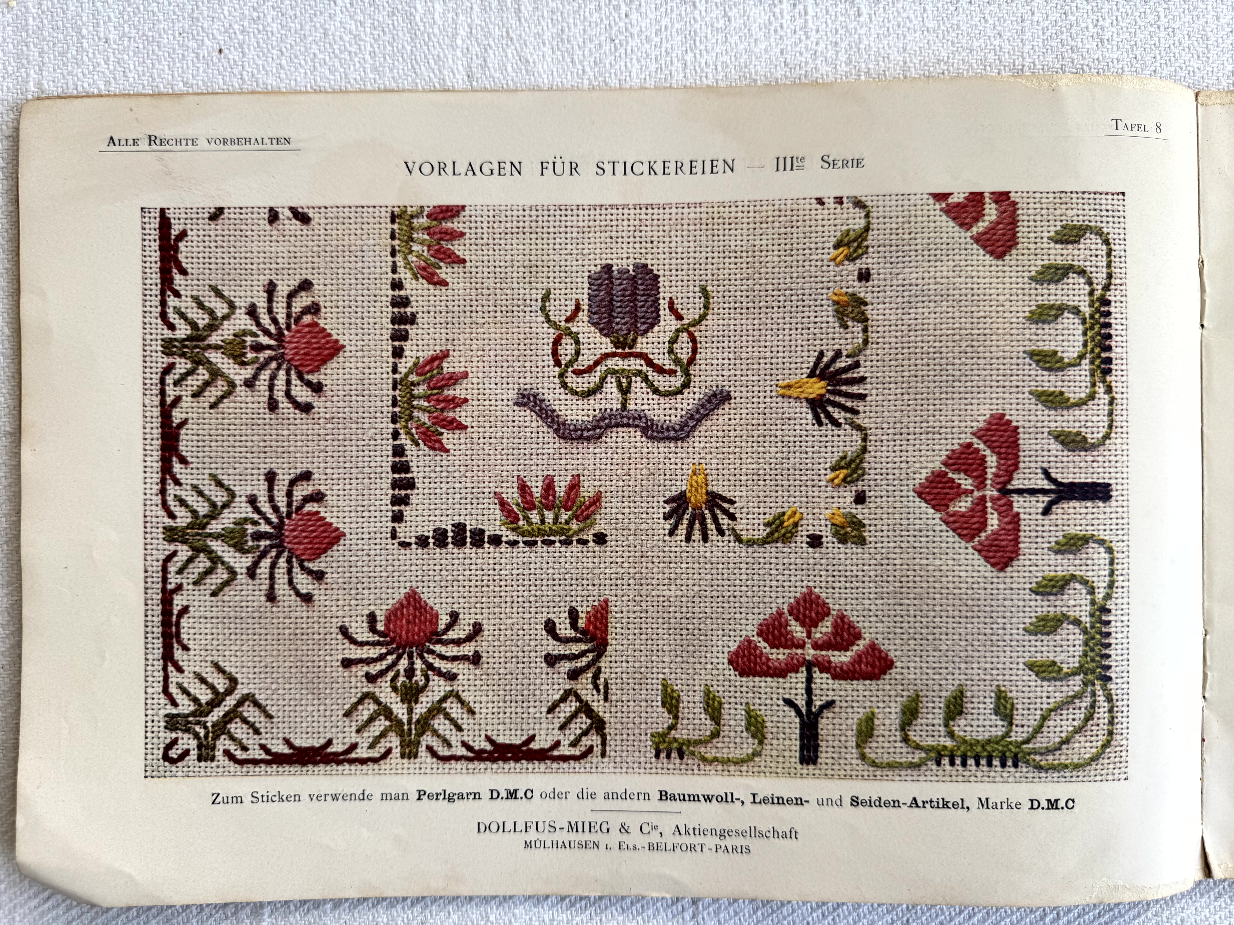 Overigens vond ik afgelopen zaterdag op de jaarlijkse Antieke Textielmarkt van de Nederlandse Kostuumvereniging een heel verfijnd, in voornamelijk rode platsteek geborduurd linnen lapje uit Marken. Daarnaast ook nog een borduurpatronenboek vermoedelijk uit de jaren dertig van DMC vol wonderschone ontwerpen.