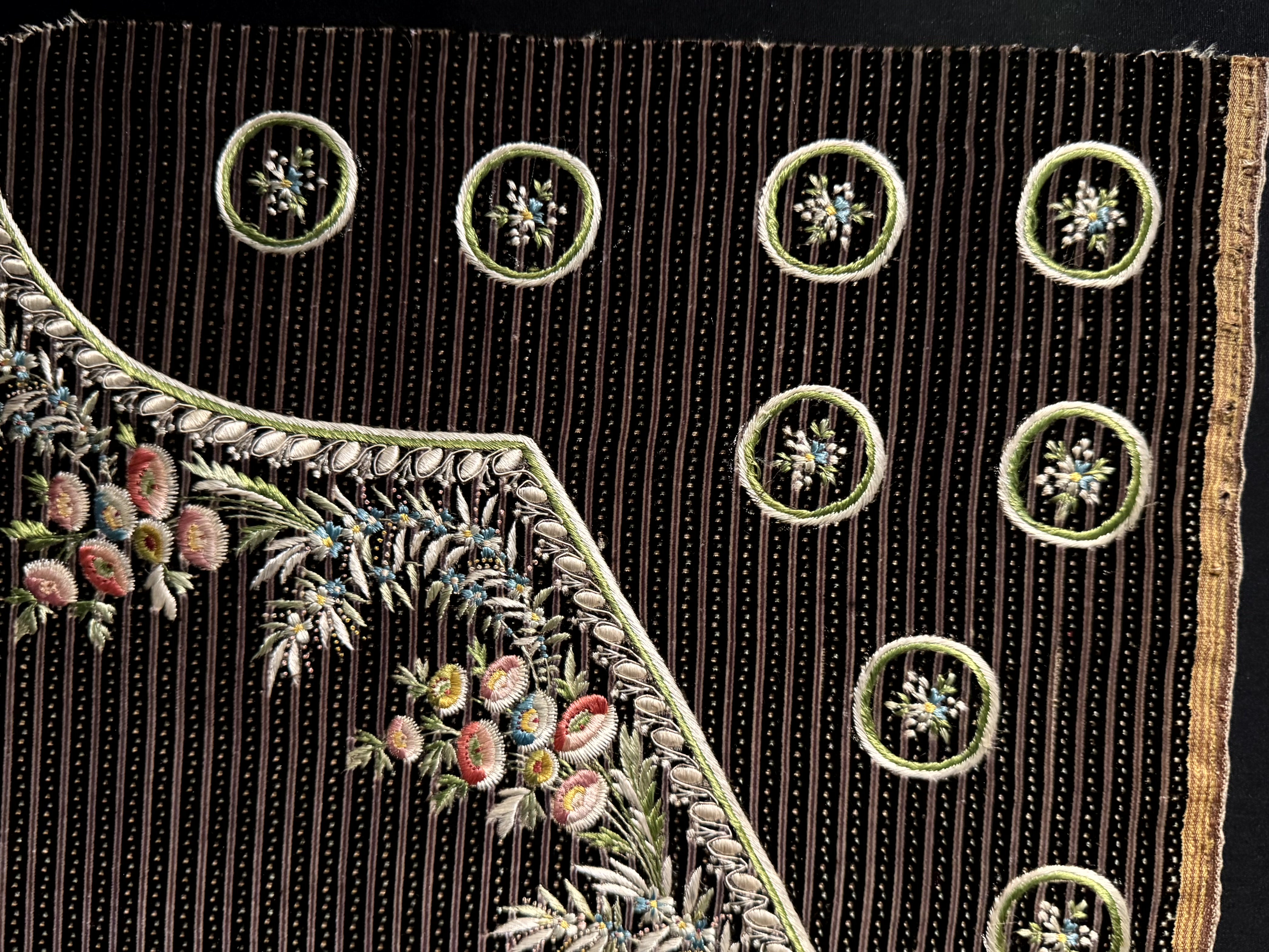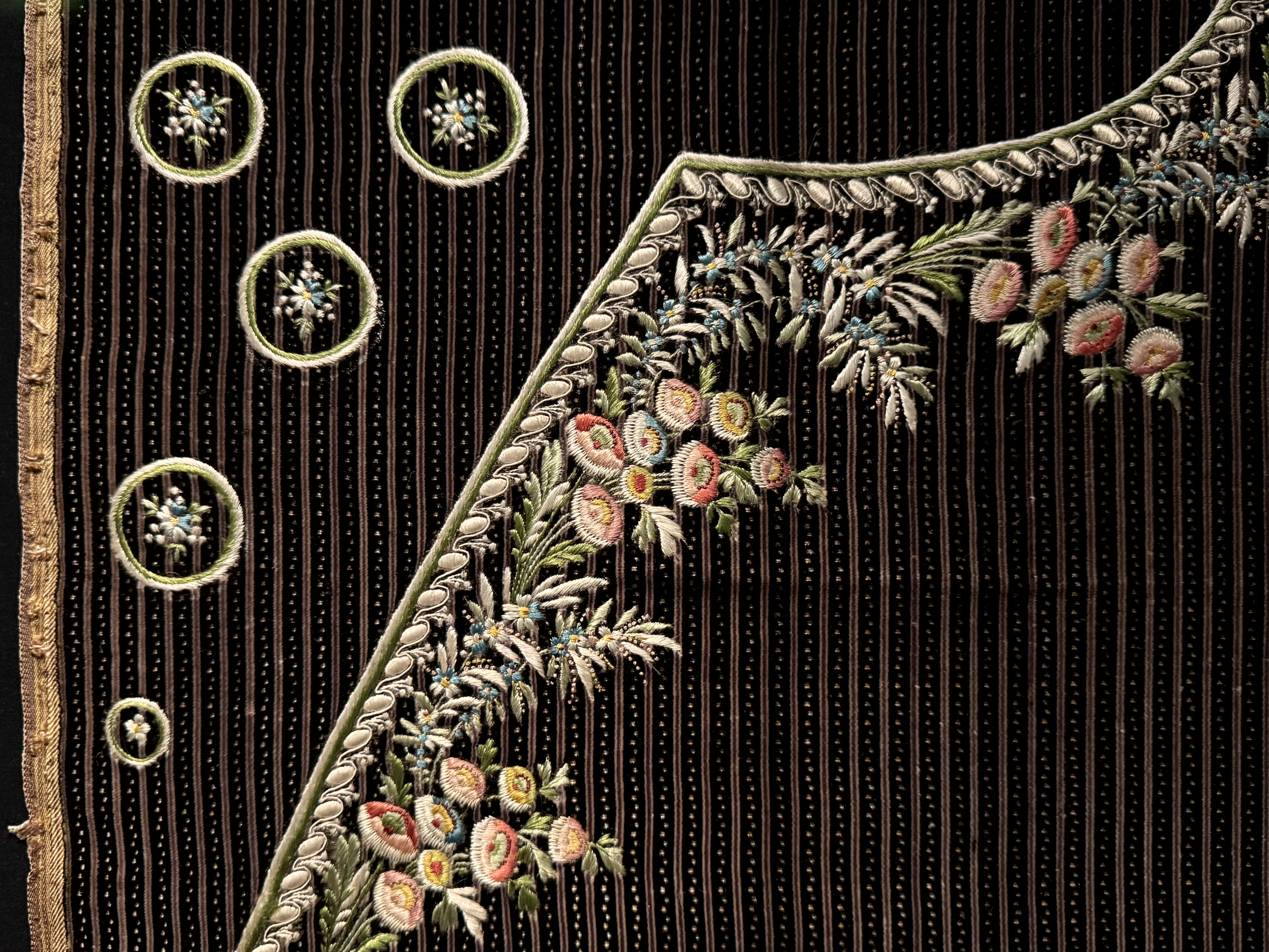 Alleen dan kon je het je permitteren om een jas of vest te laten maken van het mooiste materiaal dat er te koop was. De zijden stoffen kwamen uit Frankrijk; het borduurwerk werd uitgevoerd door gespecialiseerde borduurders (het waren mannen die borduurden!) die elke steek met de hand zetten.