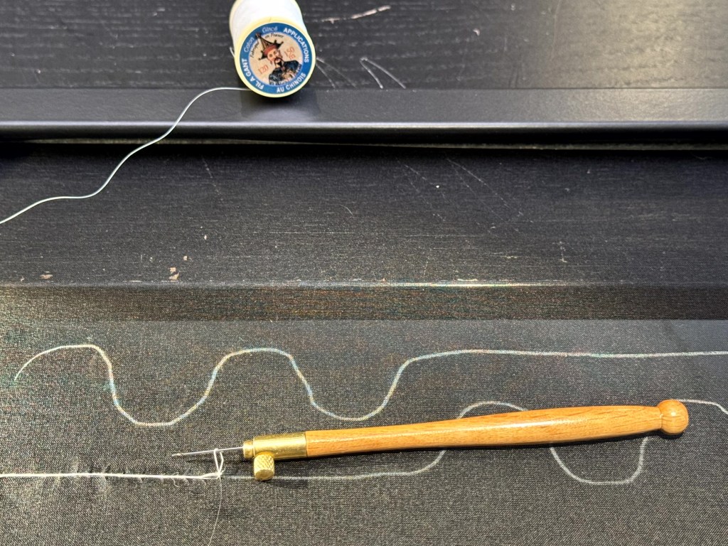 Afgelopen vrijdag ging ik naar Tilburg om de eerste beginselen van Lunéville borduren te leren tijdens een privéles van twee uur. Het is een oude borduurtechniek, die ook wel tamboereren genoemd wordt. Met een kleine haaknaald maak je kettingsteken op stof. De techniek is rond 1750 via de zijderoute vanuit India naar Europa gekomen.