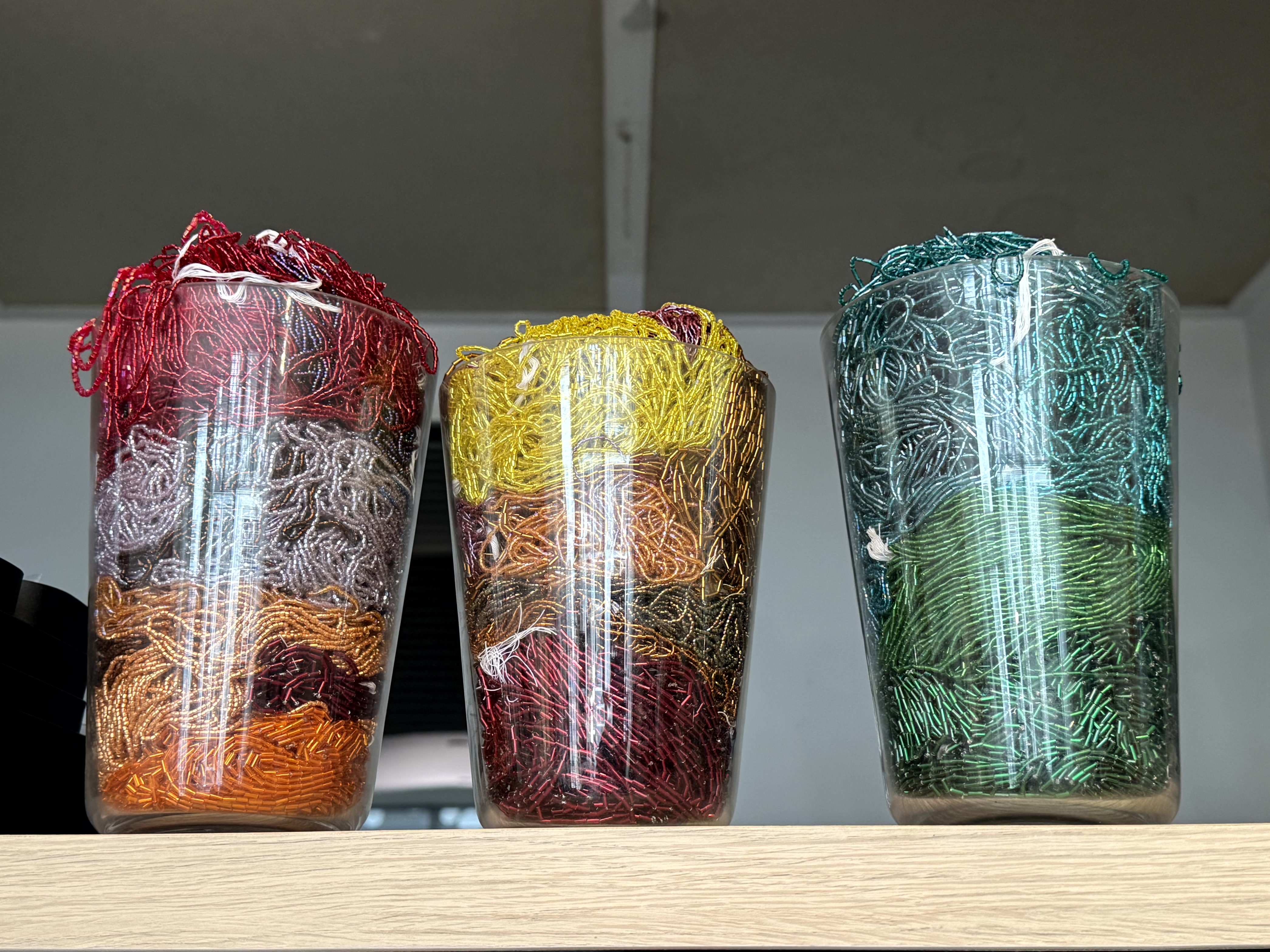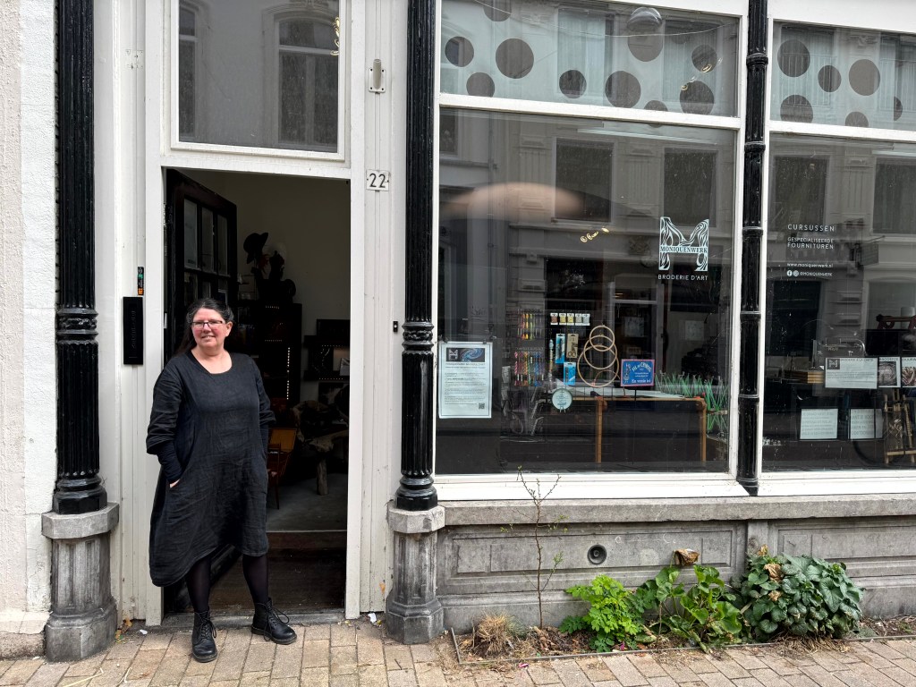 De werkplaats/winkel van het bedrijf Moniquenwerk is een schatkamer vol kleurrijke garens, glanzende pailletten, glimmende kralen en met als stralend middelpunt Monique van Munster.