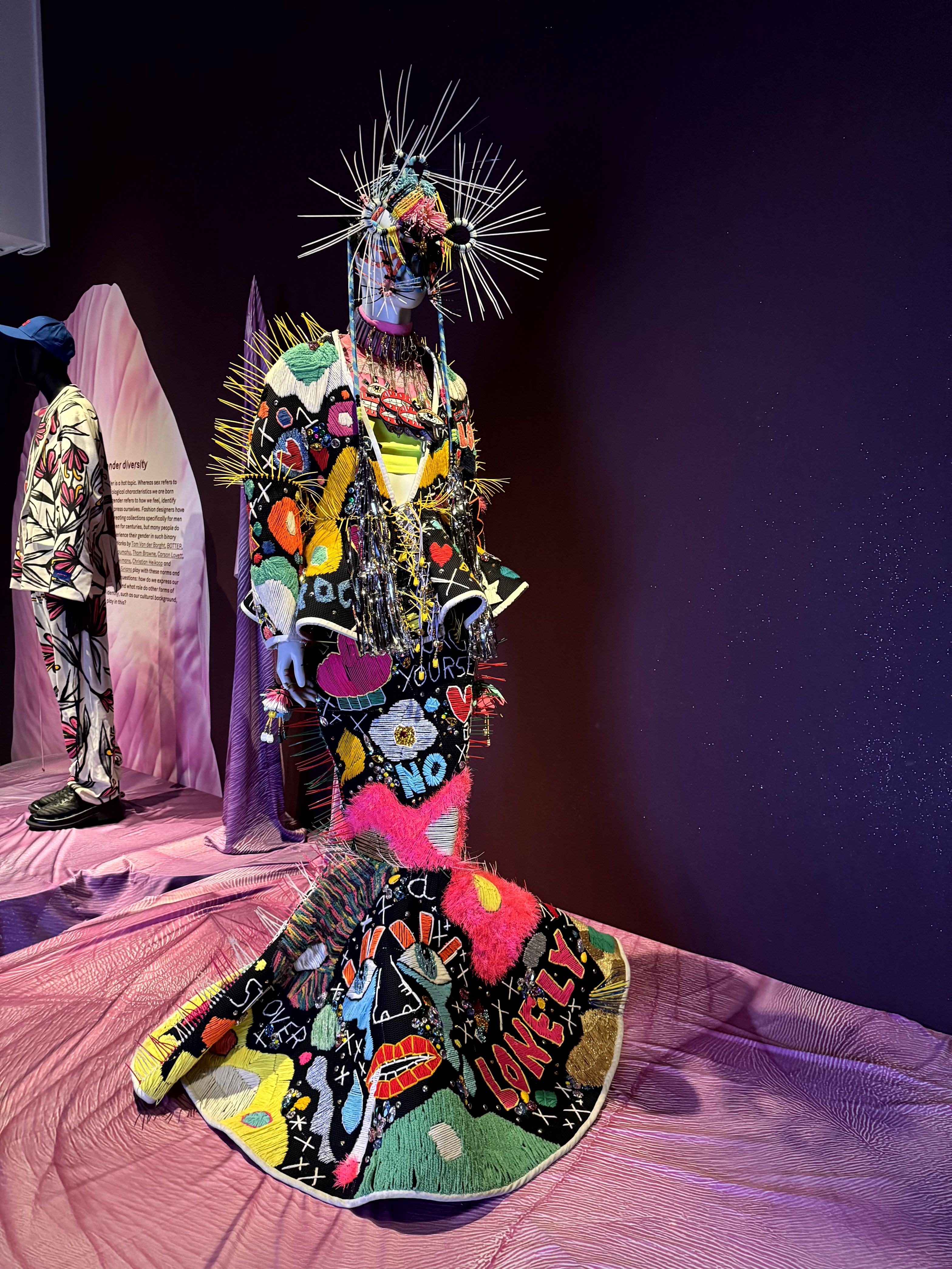 Als je goed om je heen kijkt, zie je dat op dit moment veel kunstenaars en modeontwerpers met borduren bezig zijn. Het lijkt wel een revival. Zo zag ik in het Textielmuseum een outfit van de Belgische kunstenaar en modeontwerper Tom van der Borght, waanzinnig geestig, in felle kleuren grof geborduurd.