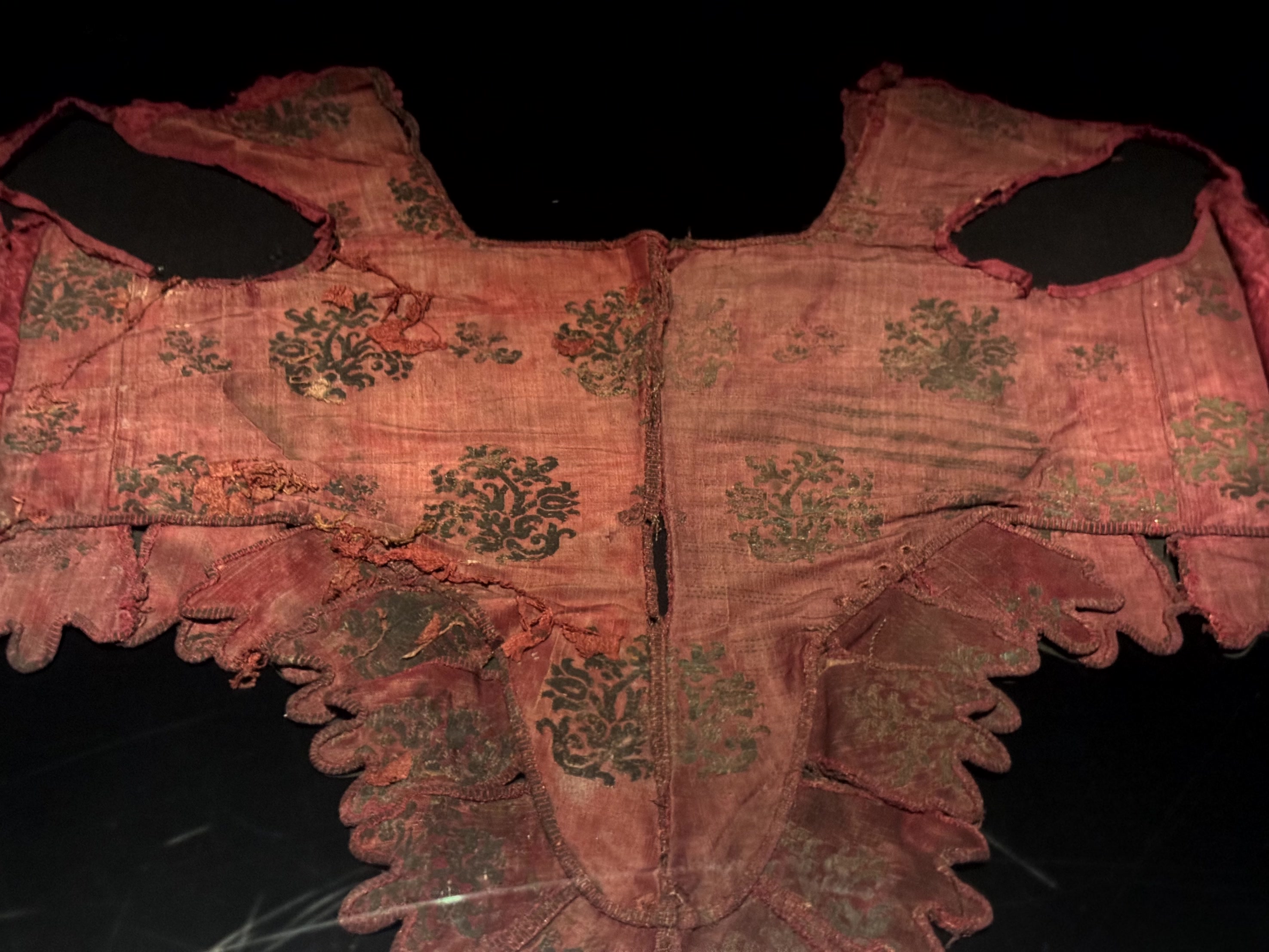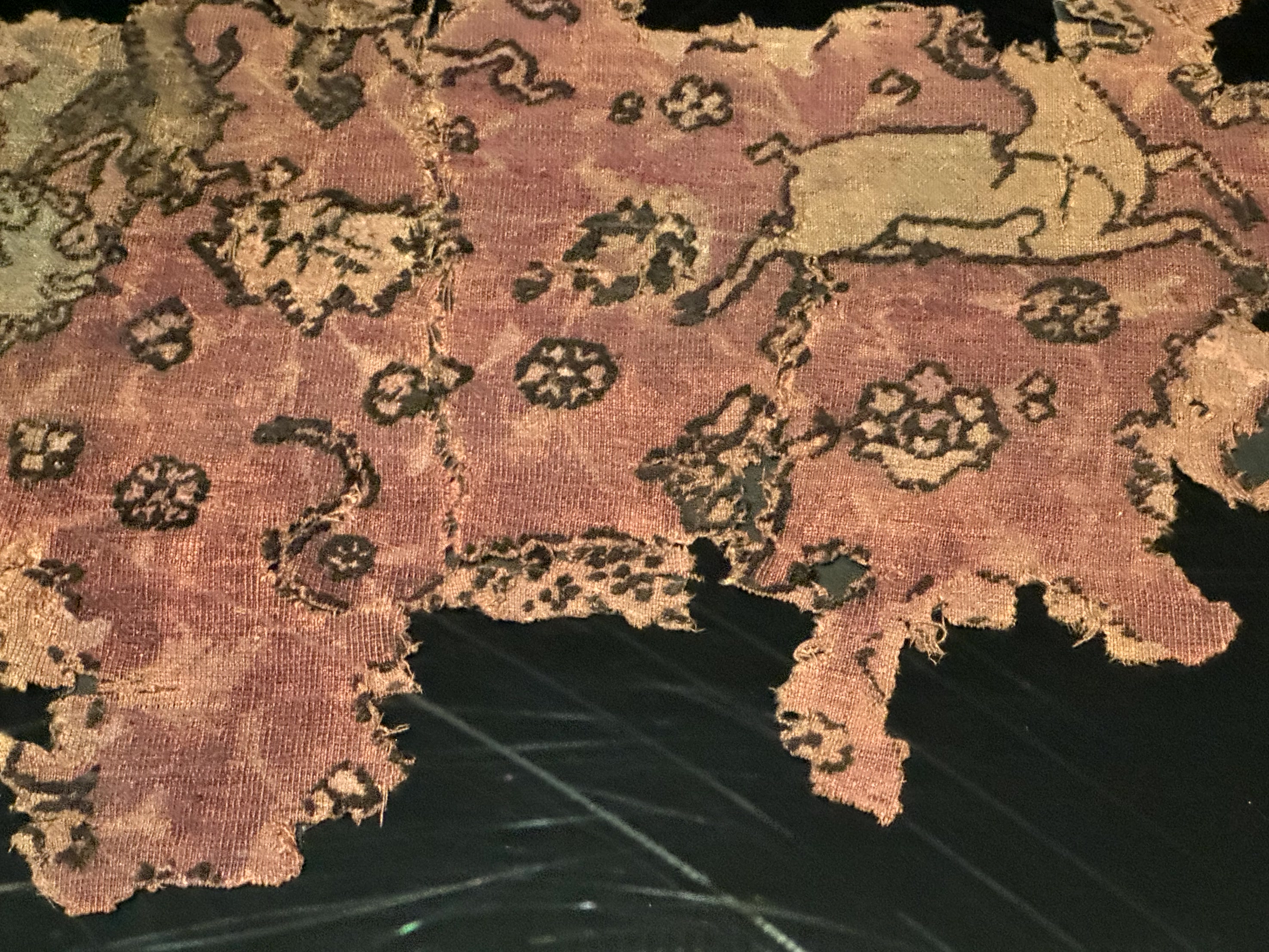 In de tentoonstellingsruimte liggen ook nog andere kleine fragmenten textiel. Een leeuw en een springend hert op een tapijt en een prachtig lijfje in rode zijde met bloemachtige ornamenten.