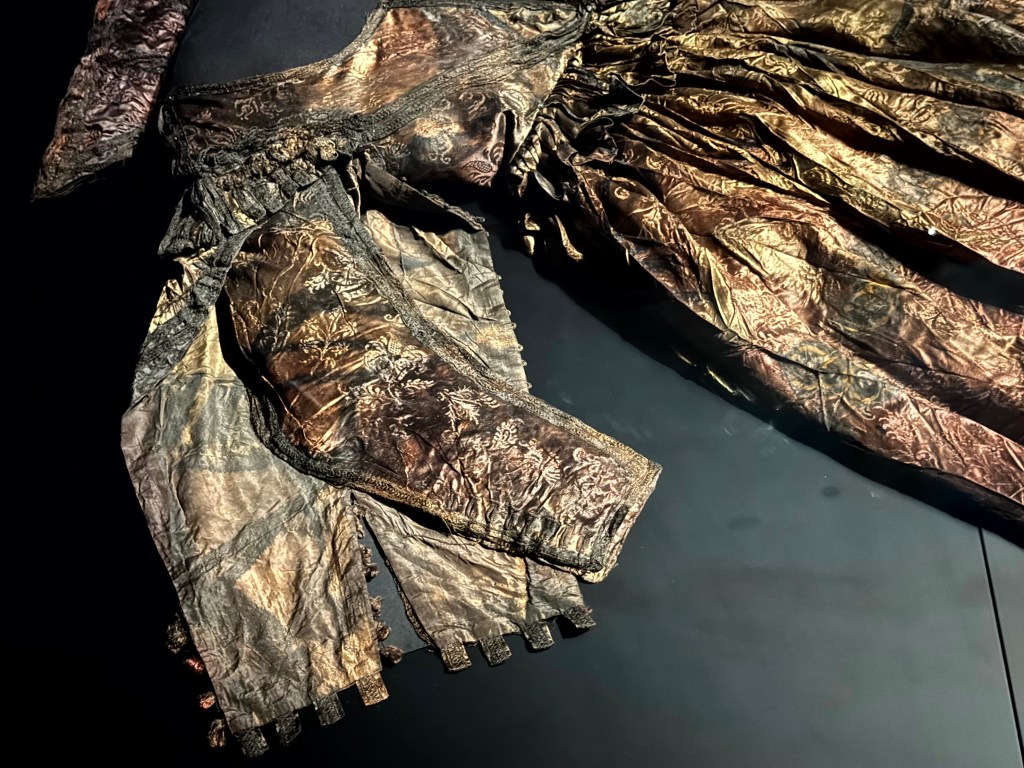 Een lijfje met een wijde rok en ingezette mouwen en overmouwen, koninklijk mooi. Het blijft een wonder dat die glanzende jurk bijna vier eeuwen op de bodem van de zee heeft gelegen en er nu nog zo goed uitziet.