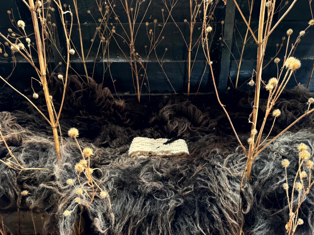 Zeven wiegjes gemaakt van wol, grassen, veren, gedroogde bloemen, oesterschelpen en ander natuurlijk materiaal. Op de achtergrond muziek en een zangstem.