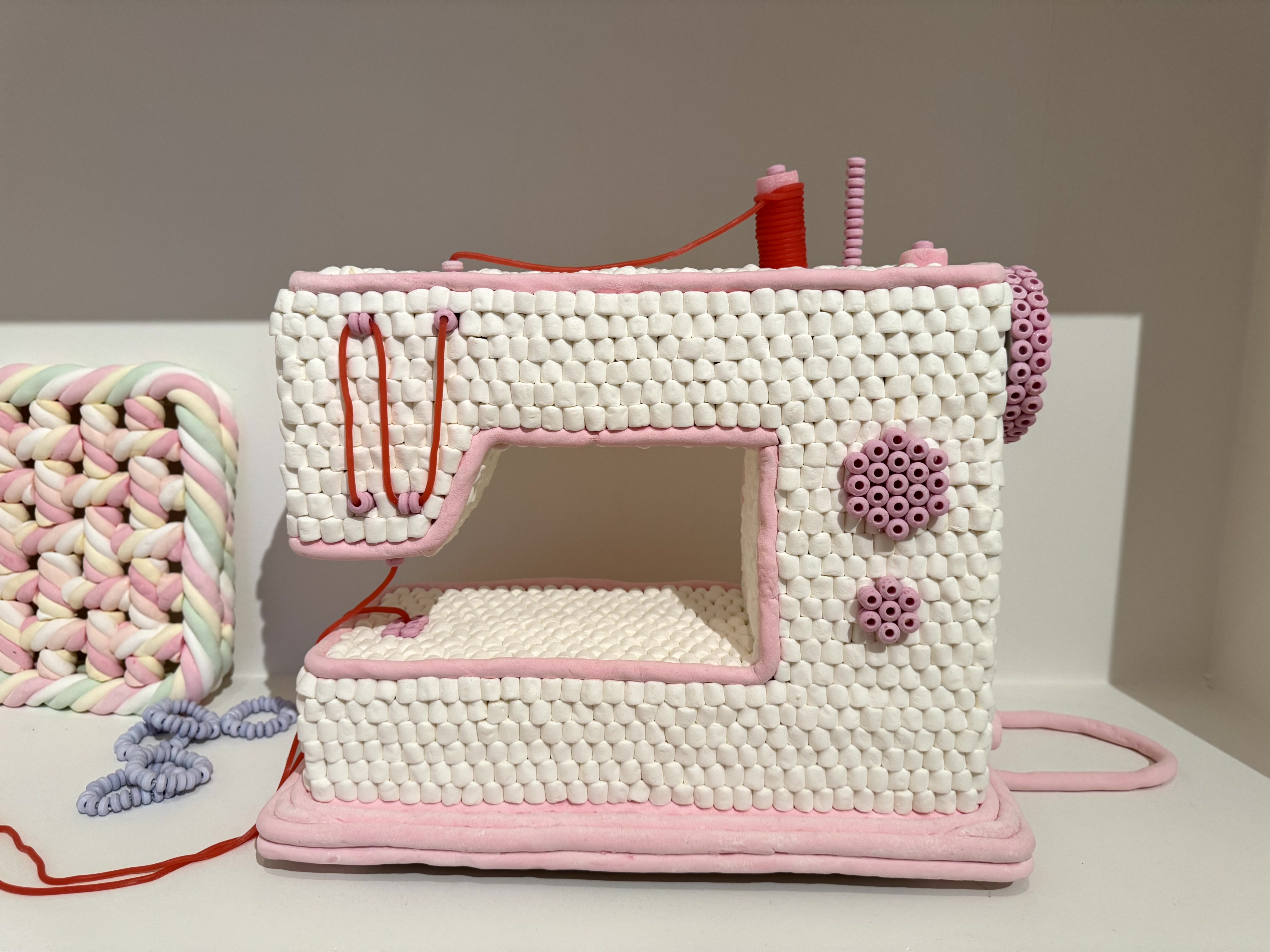 Overigens waren er nog twee naaimachines te zien in Voorlinden. Kunstenaar Simone Post heeft het huis van haar jeugd nagebouwd van snoepgoed, schuimpjes en spekkies in allerlei kleuren. ‘Sweet Memories’ heet de tentoonstelling die tot en met 31 augustus te zien is. Haar moeder gaf naailes en in die nagebouwde werkkamer stonden twee suikerzoete naaimachines. Niet om aan te likken, maar om van te genieten.