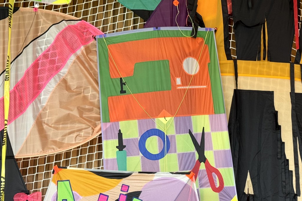 Nog voor je het clubhuis inloopt, draait er al een schitterende vlieger met slierten rondjes boven de hoofden van de bezoekers. Als je goed kijkt, zie je dat er patroondelen van een kledingstuk op te zien zijn.
