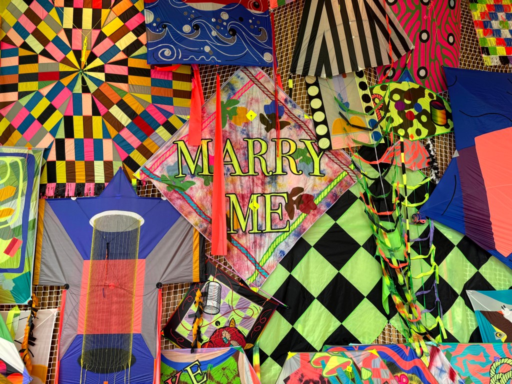 En dan, in het clubhuis zelf, word je omringd door vliegers in alle soorten en maten. Rond, vierkant, rechthoekig en met heel veel hoeken. Allemaal gemaakt in spetterende kleuren en kleurcombinaties. Niet van papier, maar van nylon spinakerdoek.