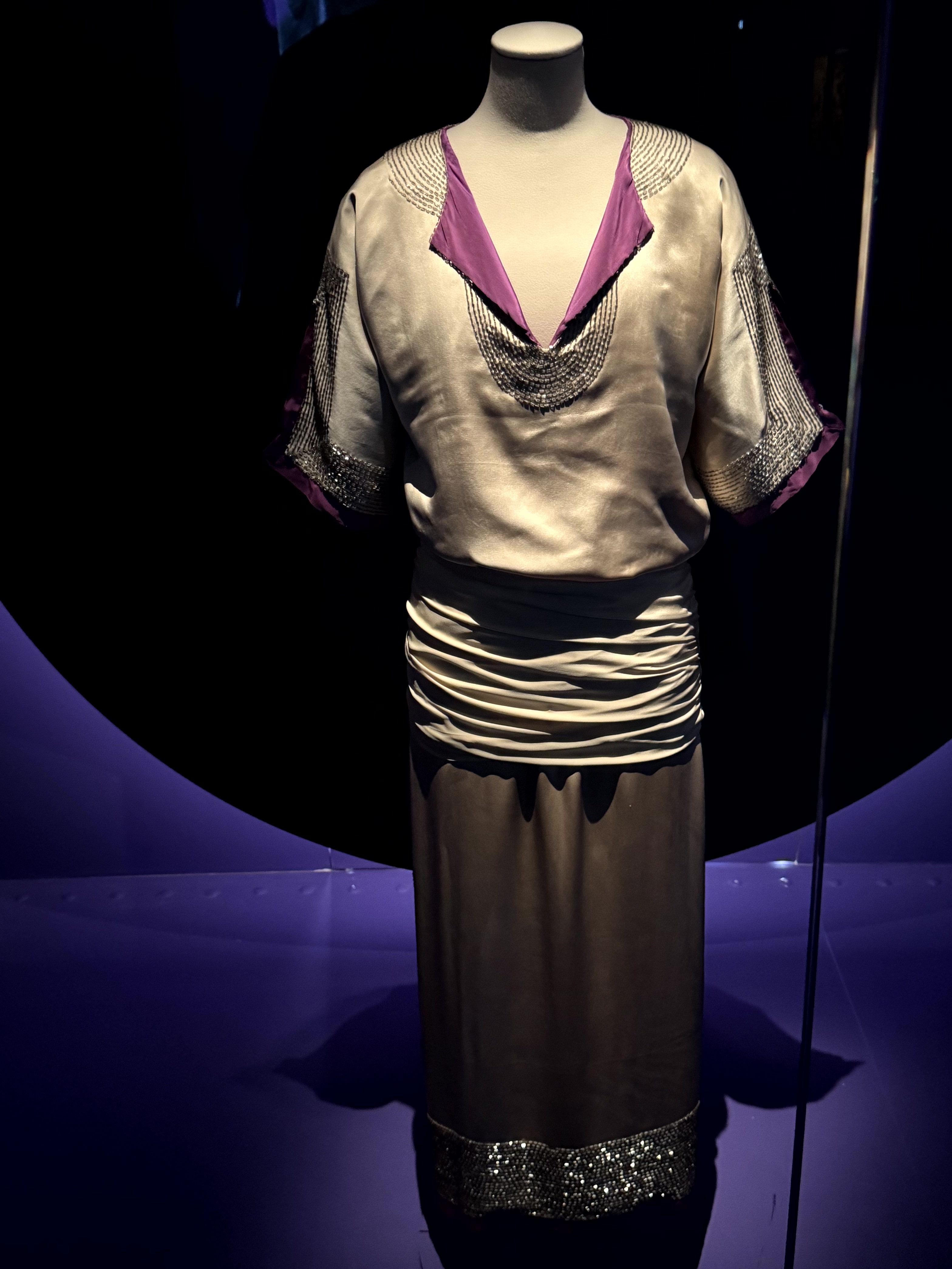 De beroemde Joséphine avondjurk (1907) met roze zijden roos middenvoor ligt naast een zwarte avondjurk (1907) die geheel geborduurd is met kraaltjes in allerlei tinten en vormen. Bij zulke creaties vraag ik me altijd af hoe lang eraan gewerkt is en of de borduurster er ook wel eens genoeg van had. Beide jurken liggen bloedmooi te wezen op een paarsblauwe ondergrond.
