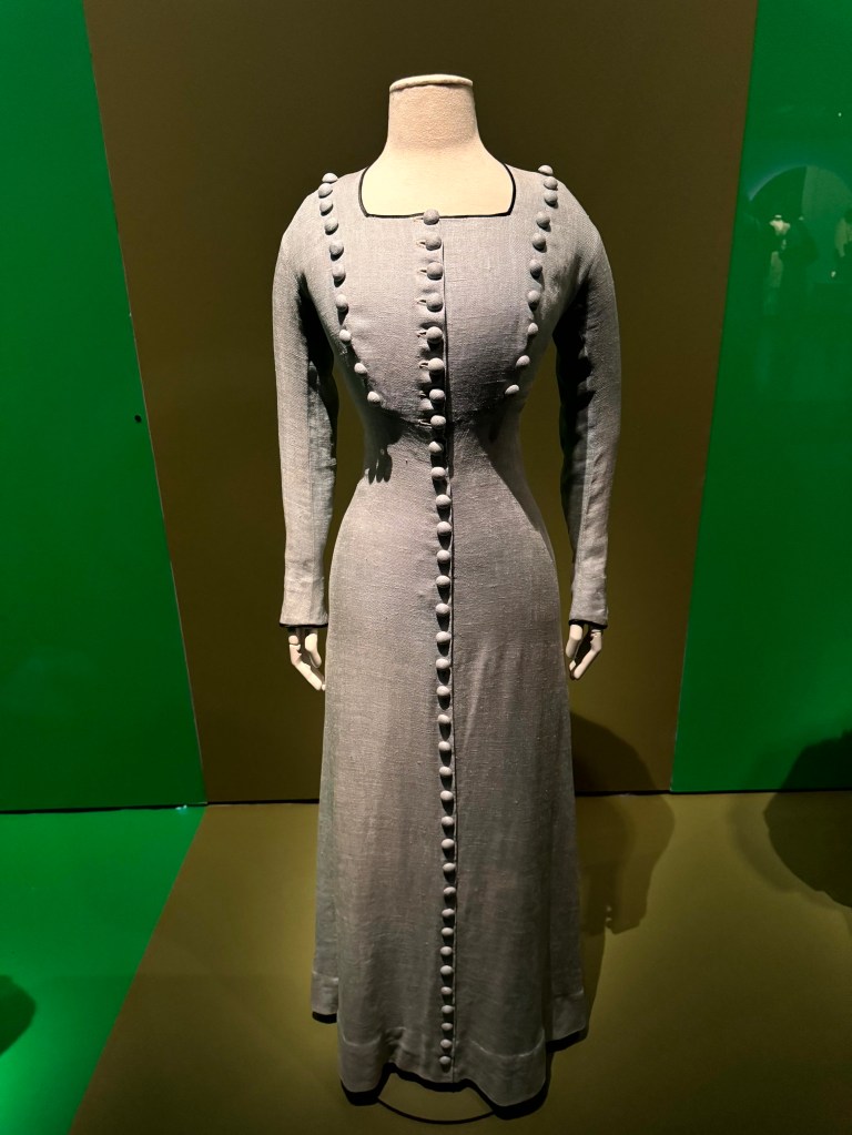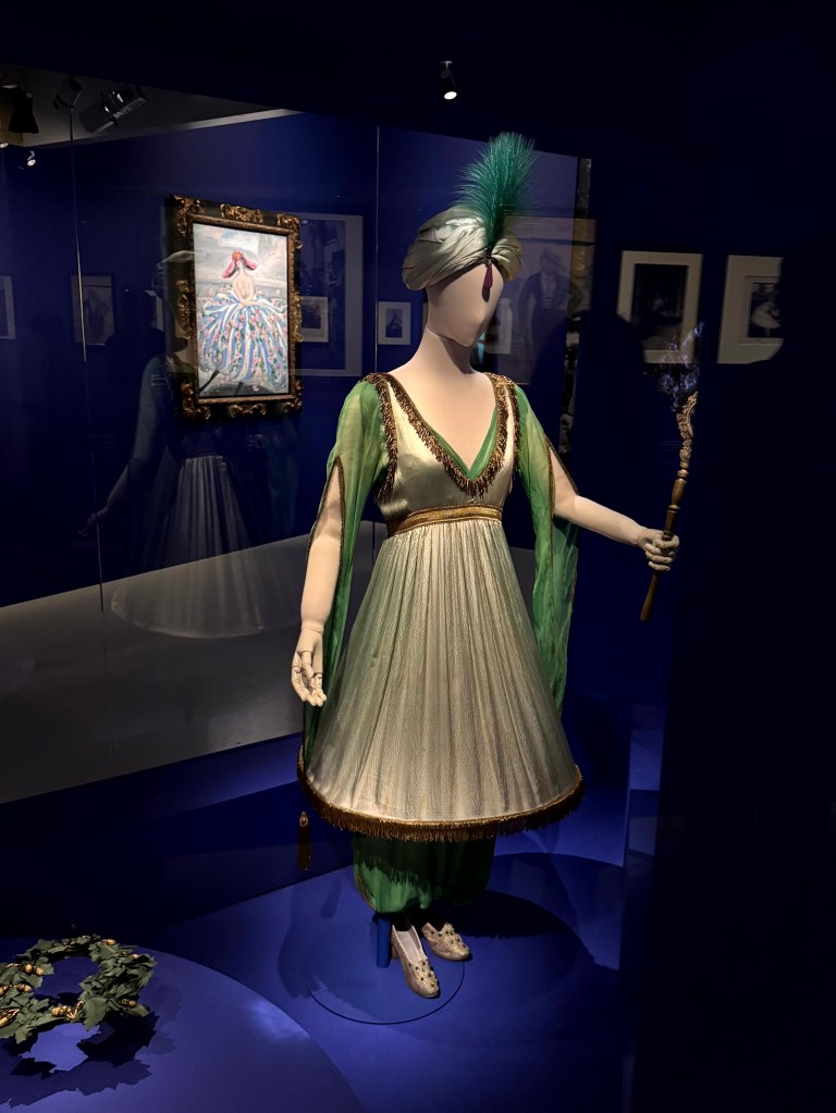 De Gavarni-jurk uit 1906 van grijs getailleerd linnen met grijze stofknopen en geaccentueerde coupenaden komt erg mooi uit tegen de twee-kleuren-groene achterwand. Onder zo’n jurk werd natuurlijk nog een korset gedragen; dat was gebruikelijk in de mode van rond de eeuwwisseling. Dat zag ik ook eerder vandaag in de expositie van Worth. Overigens heeft Poiret nog een korte tijd bij Worth gewerkt, maar hun samenwerking was geen succes. Worth vond de ontwerpen die zijn werknemer maakte vulgair en Poiret zag in dat hij beter zijn eigen weg kon volgen door zelf een modehuis op te richten.
