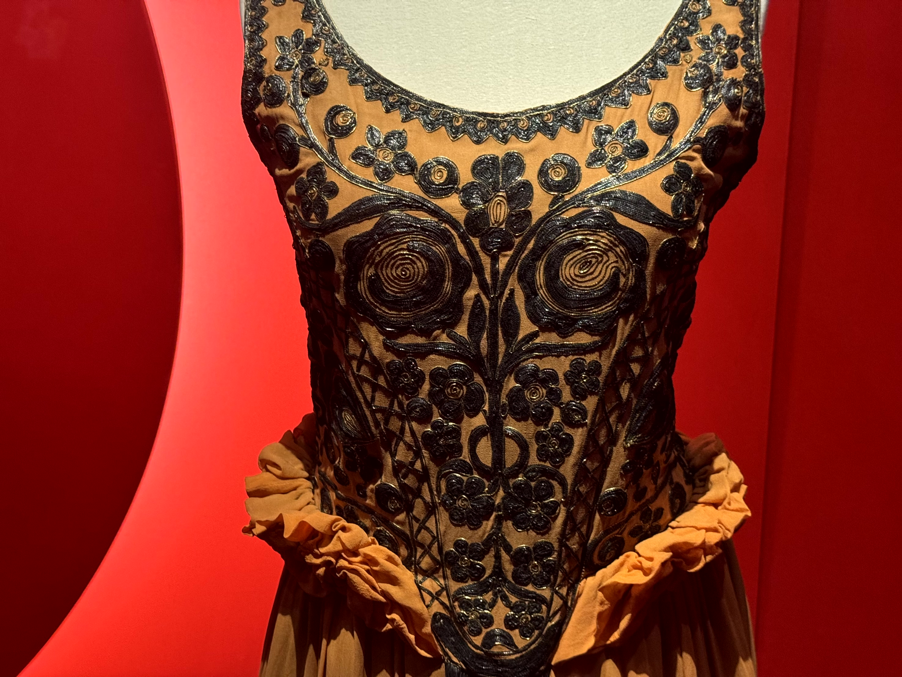 De eerste jaren maakt hij nog jurken die op dat moment ‘en vogue’ zijn zoals deze fluwelen jurk met rozen of de japon met borduursels van bijen.