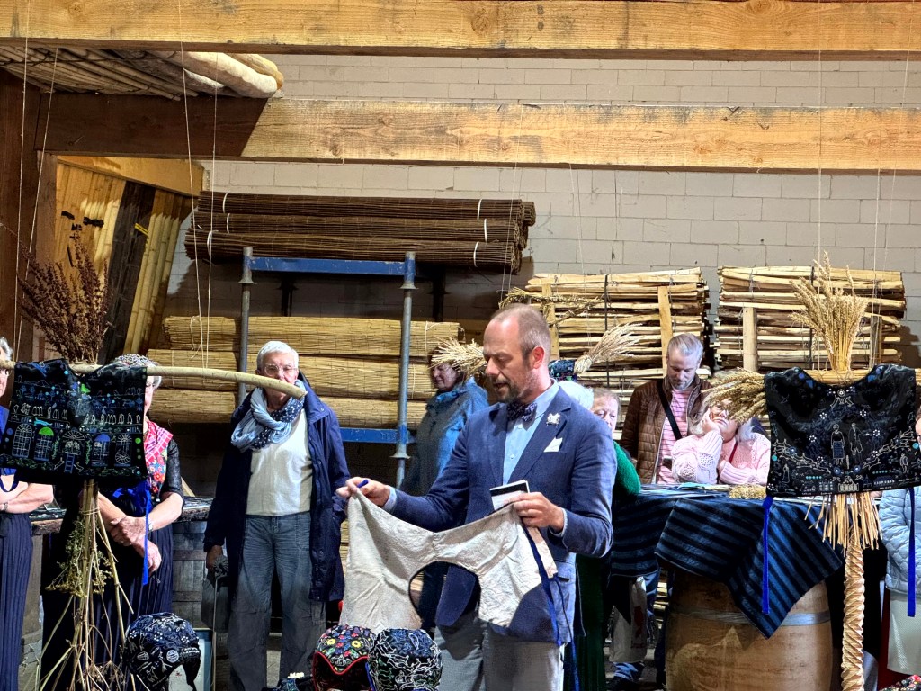 Jacco liet zijn laatste vondst zien die hij net had gekocht: een kraplap gemaakt van 27 kleine lapjes gebloemde stof, want ook in Staphorst gaan ze zuinig om met materiaal.