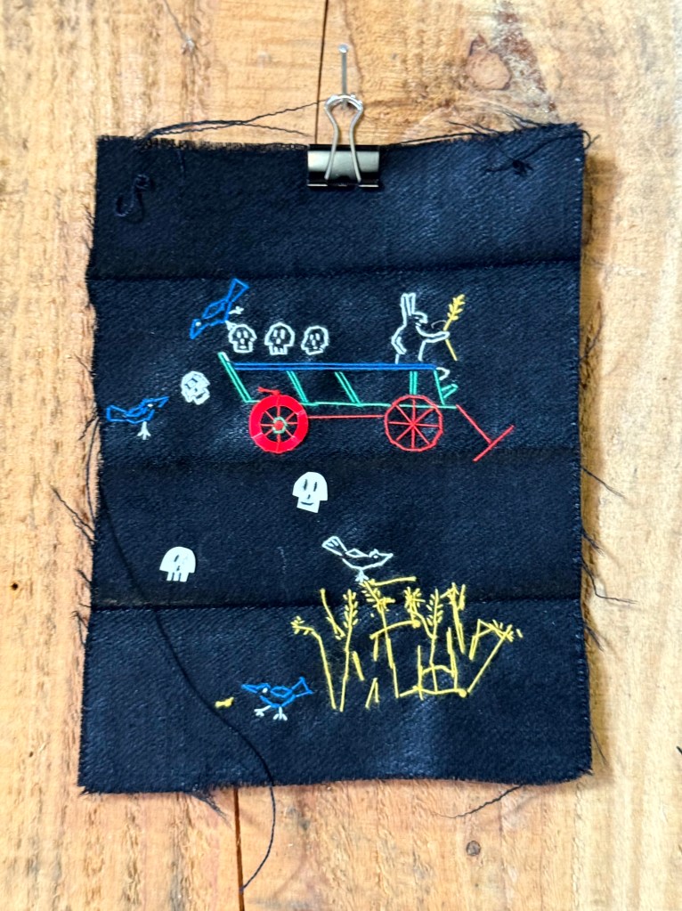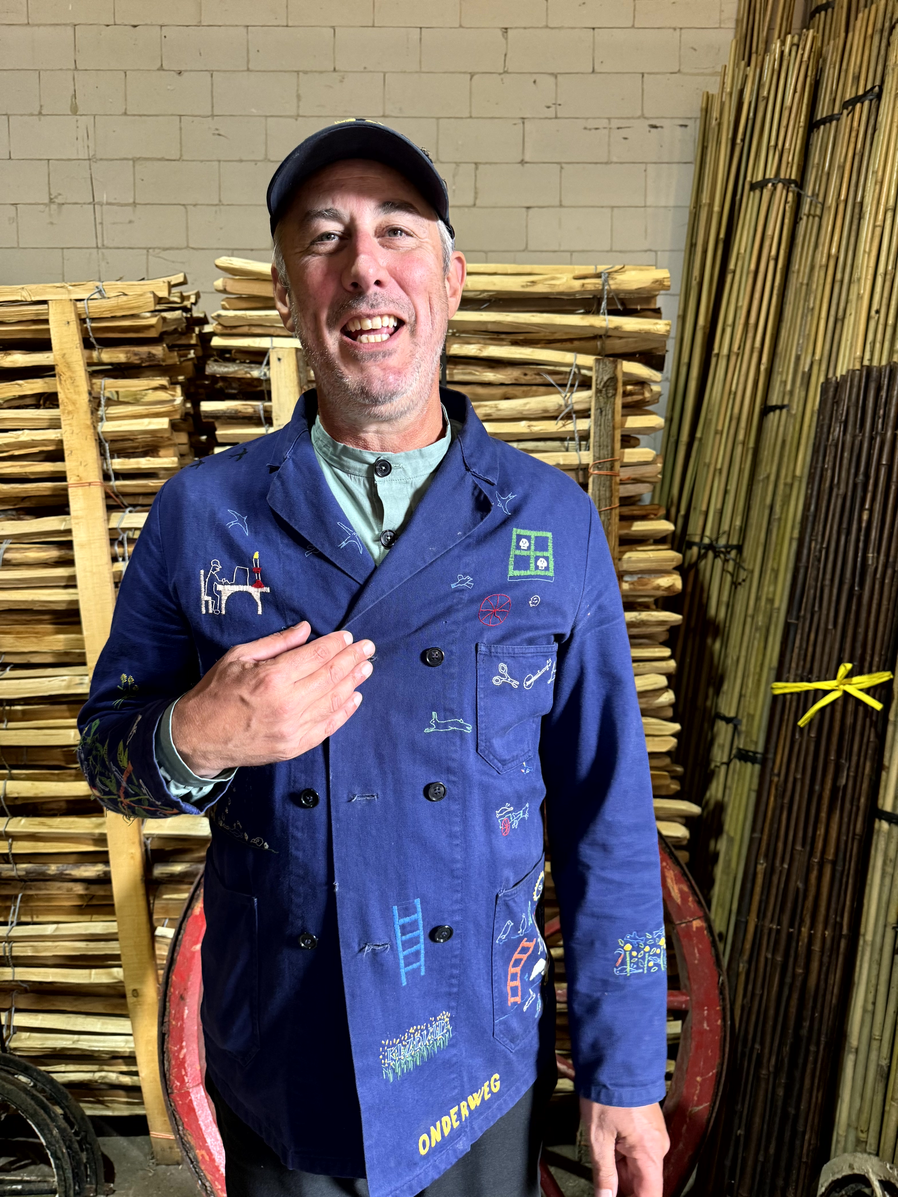 Ook borduurde ze woorden en afbeeldingen op zijn werkmanjasjes.