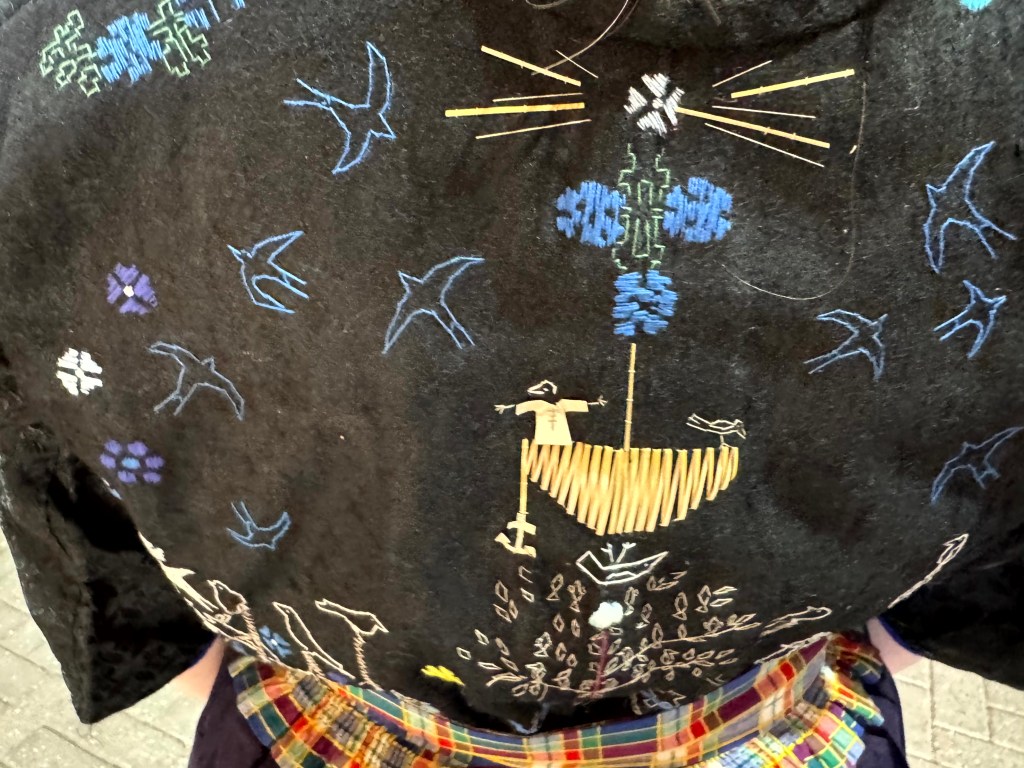 Als opening van de expositie ‘Van ver gekomen’ vond er een performance plaats. Lum, die haar hele leven gewerkt heeft als naaister van de Staphorster dracht, kleedde Daphne aan. Gekleed in een rode baaien rok en een eenvoudig jak erboven ging eerst de door Daphne geborduurde kraplap aan.
