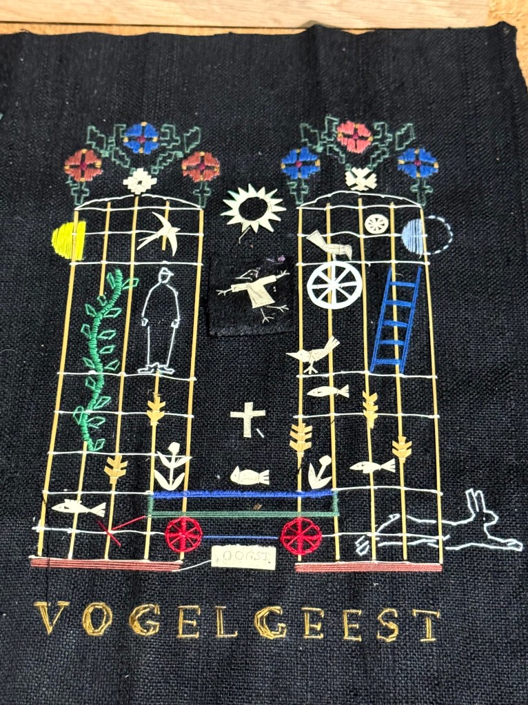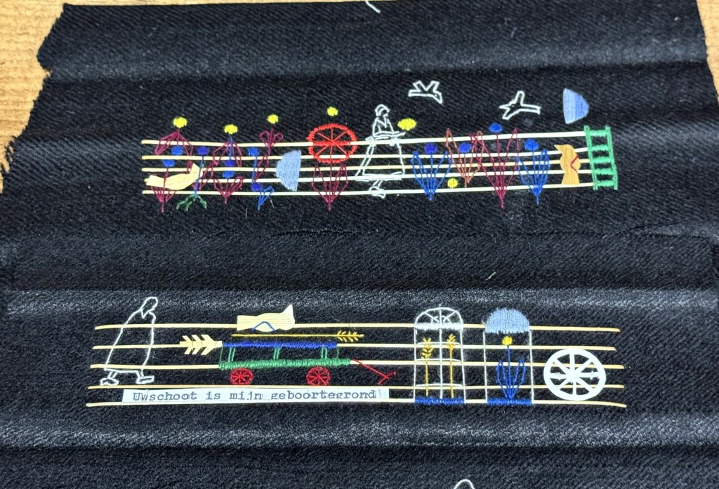Naast de kraplappen en mutsjes borduurt Daphne haar zielsverhalen op oude verweerde lapjes traditionele Staphorster stof.