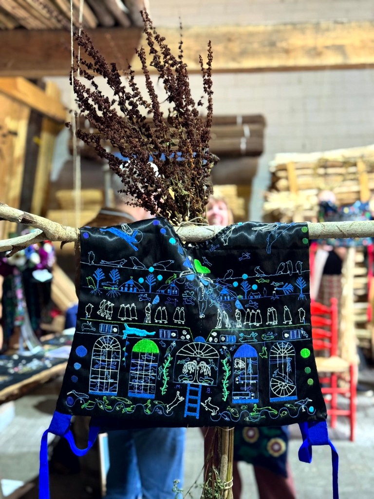 Door de ruimte heen stonden graangeesten die geborduurde kraplappen droegen in alle kleuren.