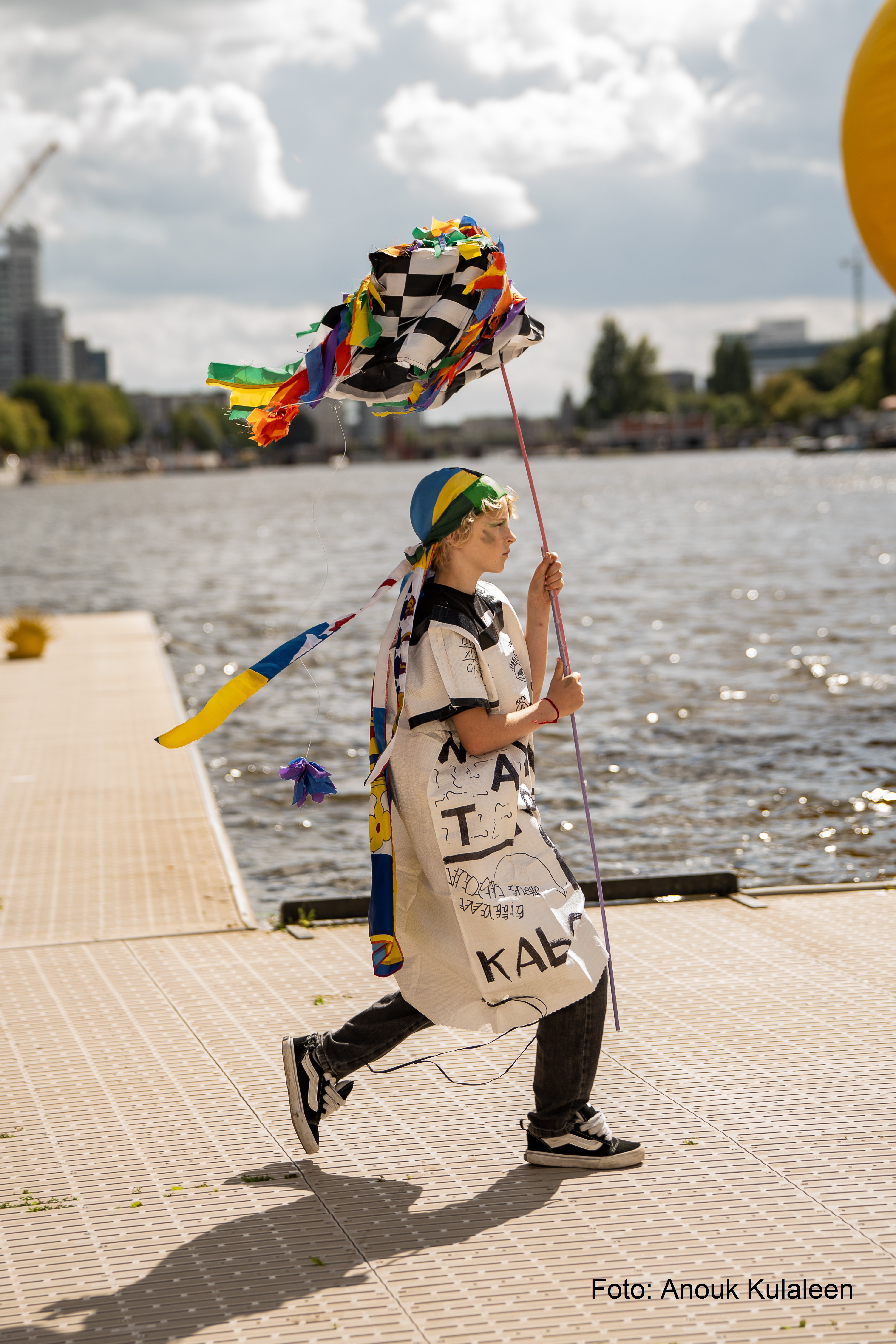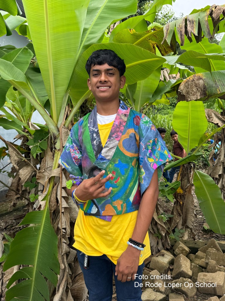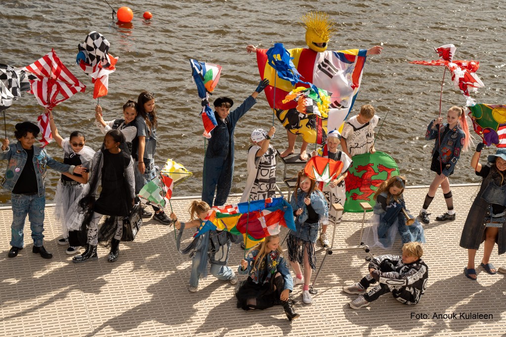 Met het thema ‘Hoop’ als startpunt maakten Amsterdamse basisschoolleerlingen van verschillende scholen onder leiding van kunstdocenten Francesca Vonck en Natasja Admiraal de ‘Collectie Amsterdam 750’. Zeg maar, het modecadeau aan de stad met een persoonlijke boodschap: ‘Wees zuinig op de wereld’ en ‘Iedereen mag zichzelf zijn’.