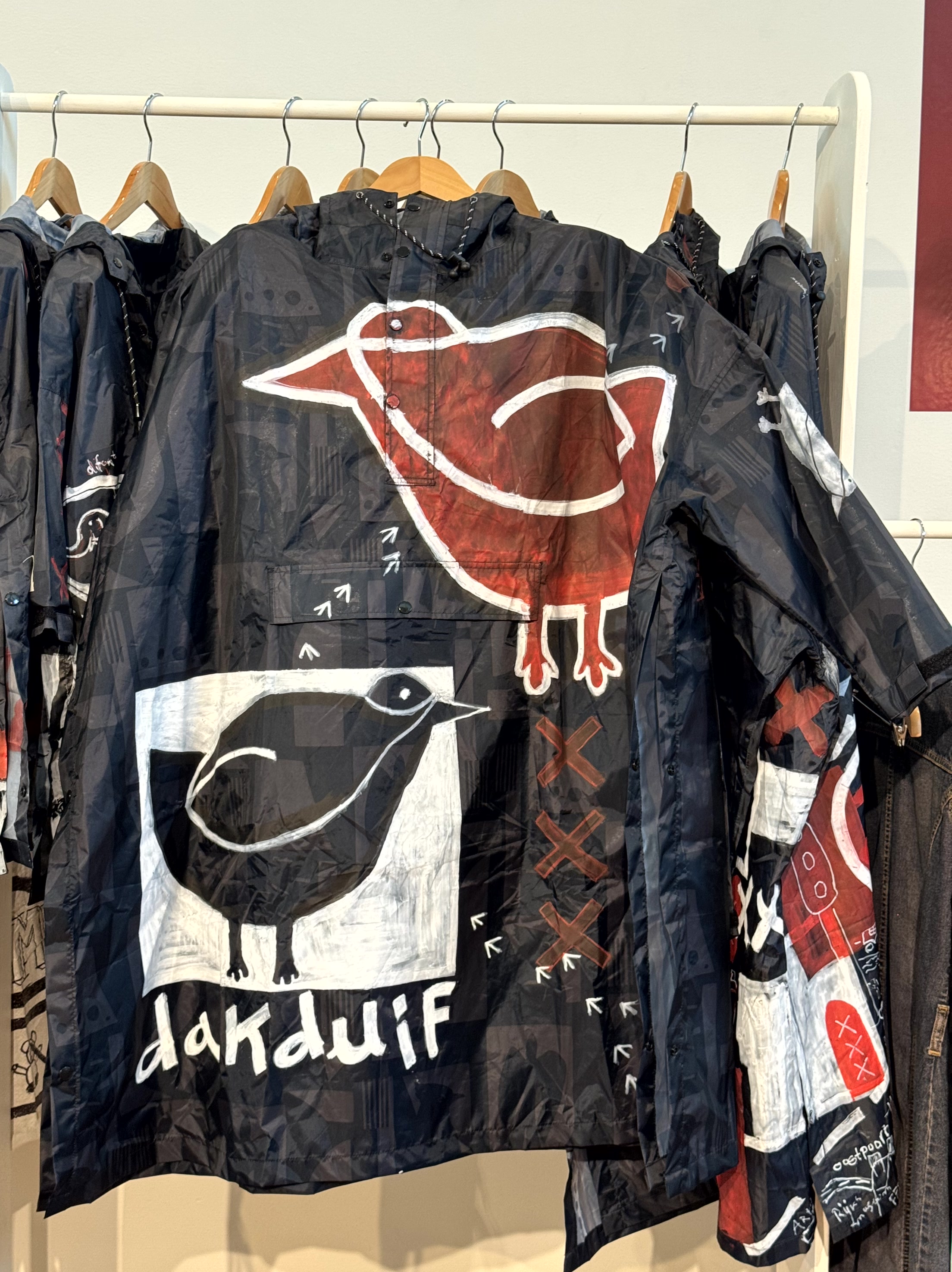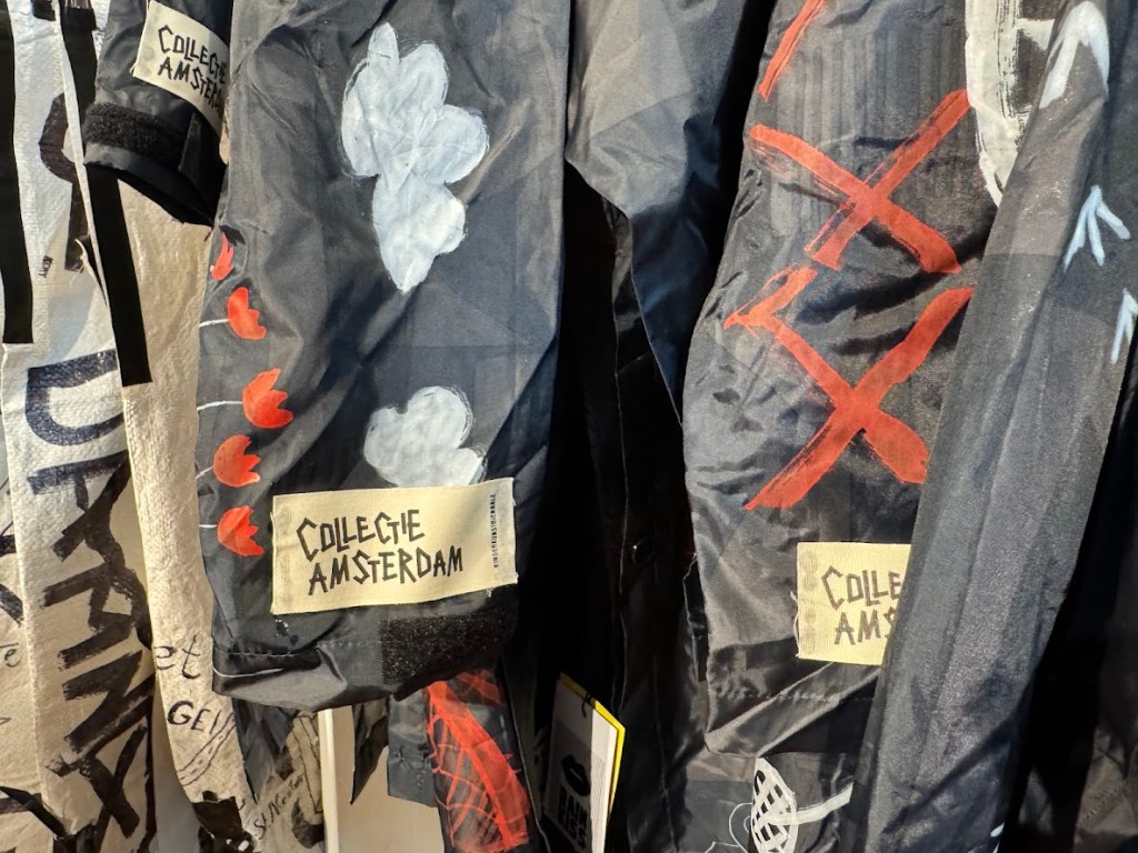 Op poncho’s en anoraks van het Amsterdamse duurzame Modemerk Rainkiss zijn tekeningen gemaakt met als uitgangspunt: Dit wil ik aan als het regent op Koningsdag!
