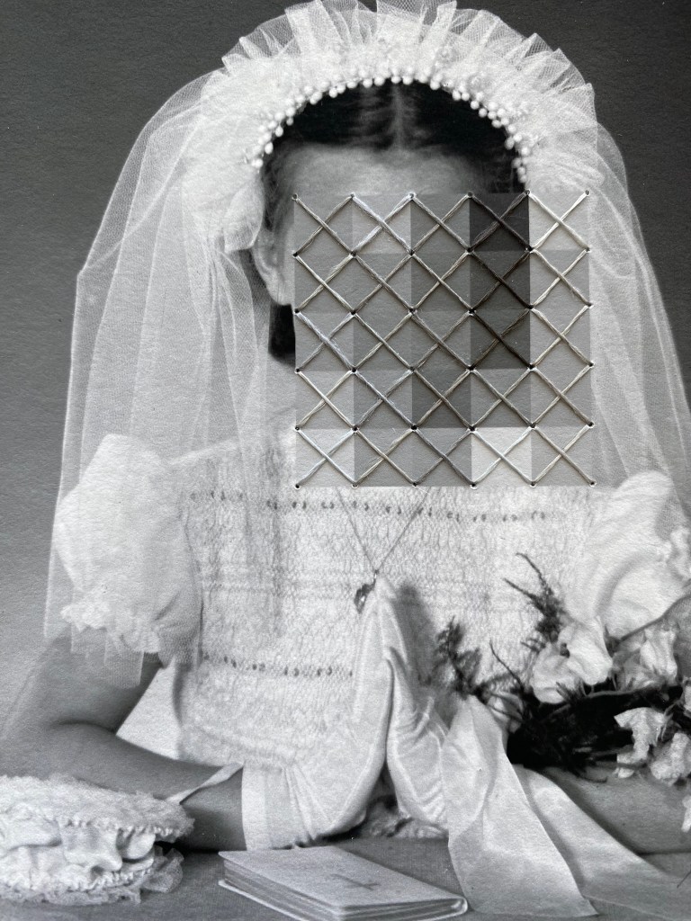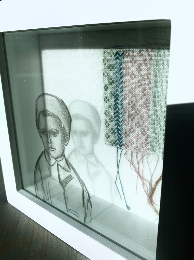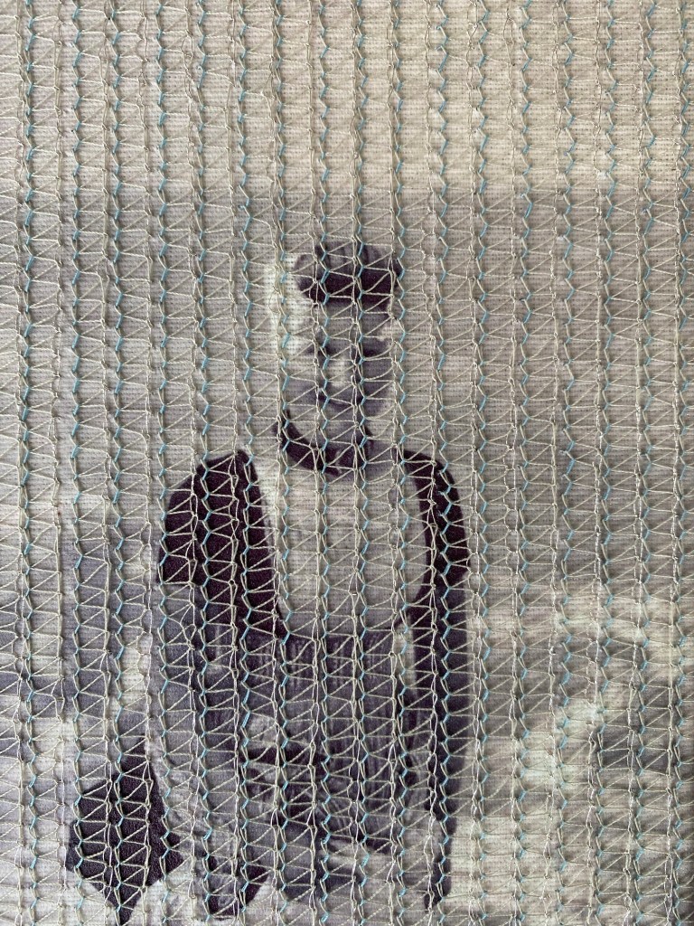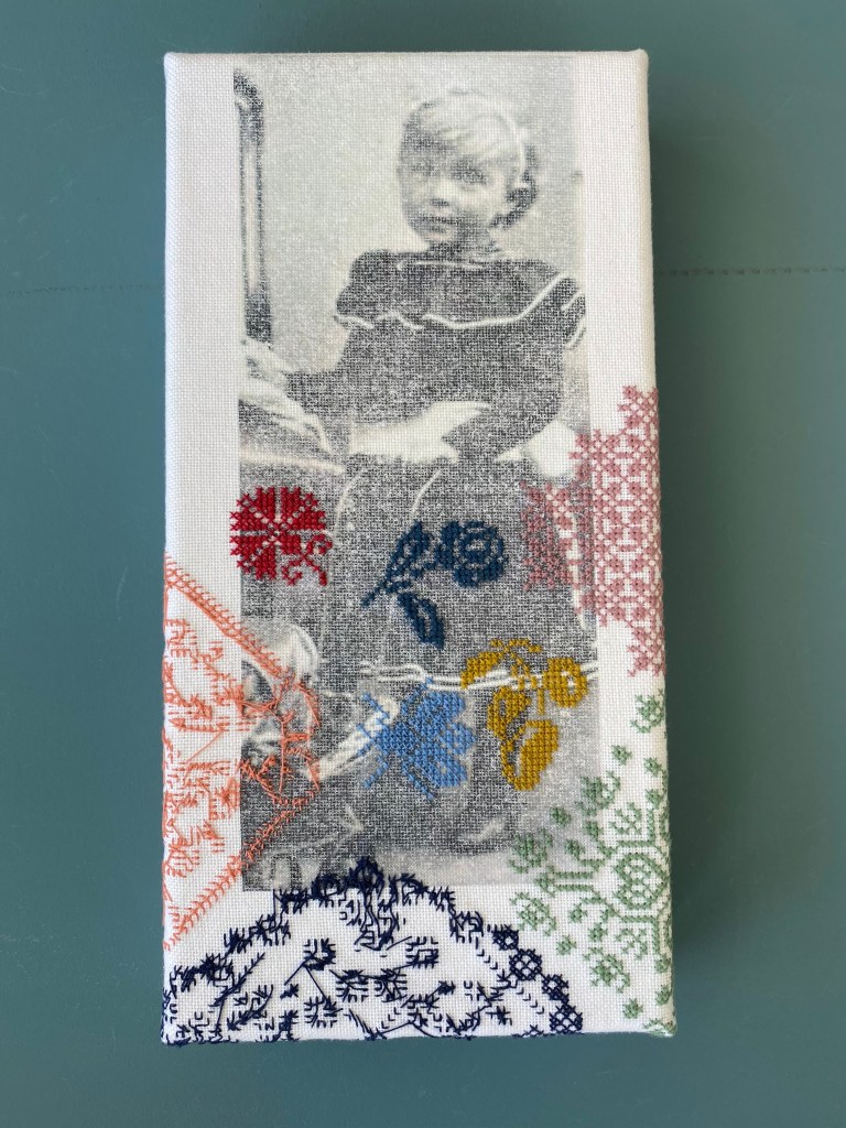 Er kwamen stopwerkpatronen op haar pad. Via Marktplaats schafte ze een grote hoeveelheid borduurgarens aan. Ze kreeg een map met foto’s van haar familie in handen en daaruit ontstond het idee om op de foto’s stopwerkpatronen te borduren en zo de familiegeschiedenis te repareren.
