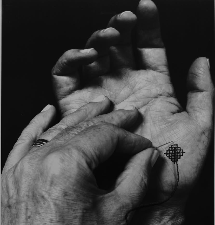 Dat ‘stoppen’ van de familiegeschiedenis ziet Renee Toonen ook als een metafoor voor het stoppen en het helen van haar eigen geschiedenis. Borduren gaat voor haar ook over jezelf repareren en weer meedoen. De reparerende kracht van een techniek kan je bij het leven houden. Zelf heb dat ook ervaren toen mijn man Bram ernstig ziek werd en breien mijn redding werd: zo kon ik in het moment blijven en daardoor ook de ernst aan.