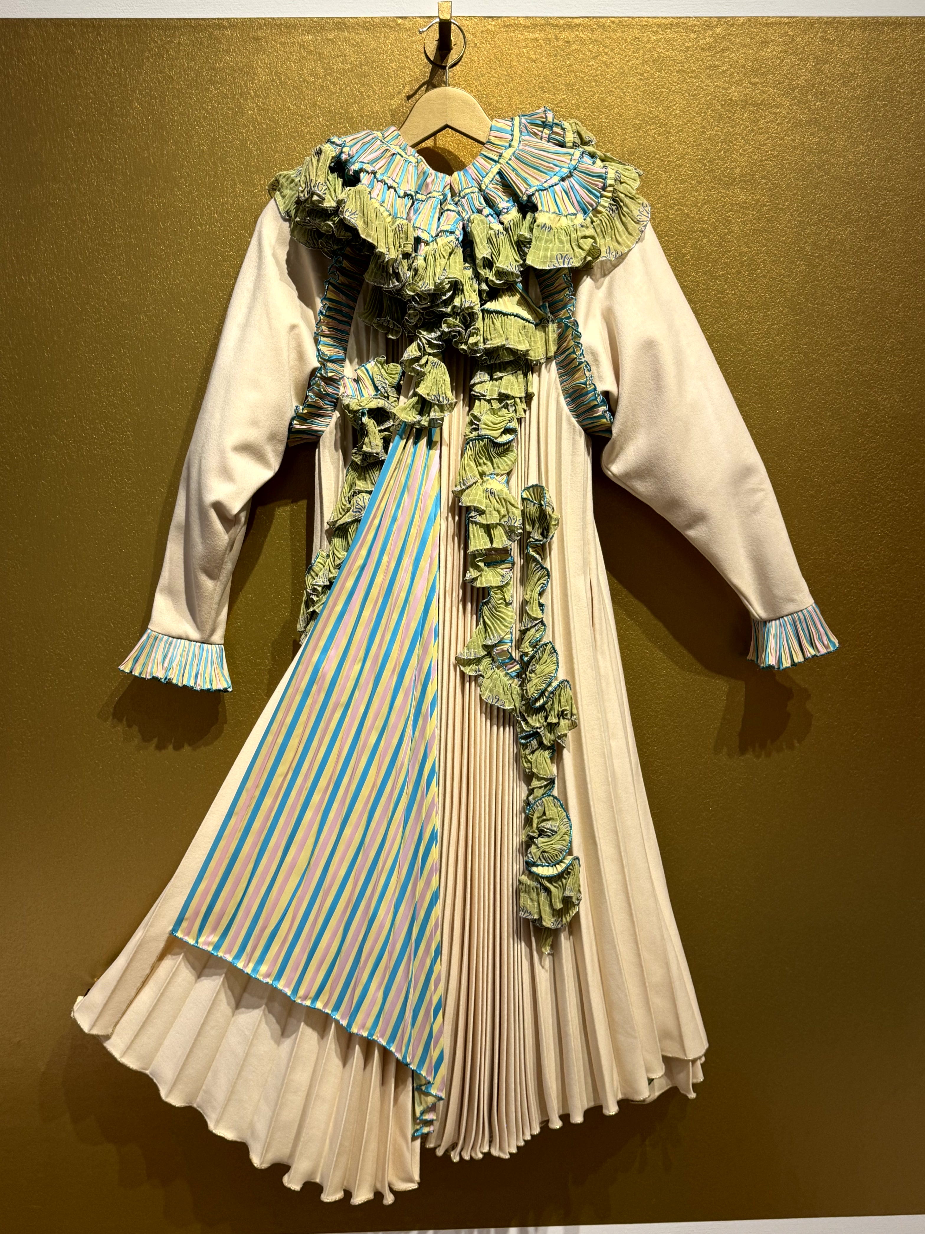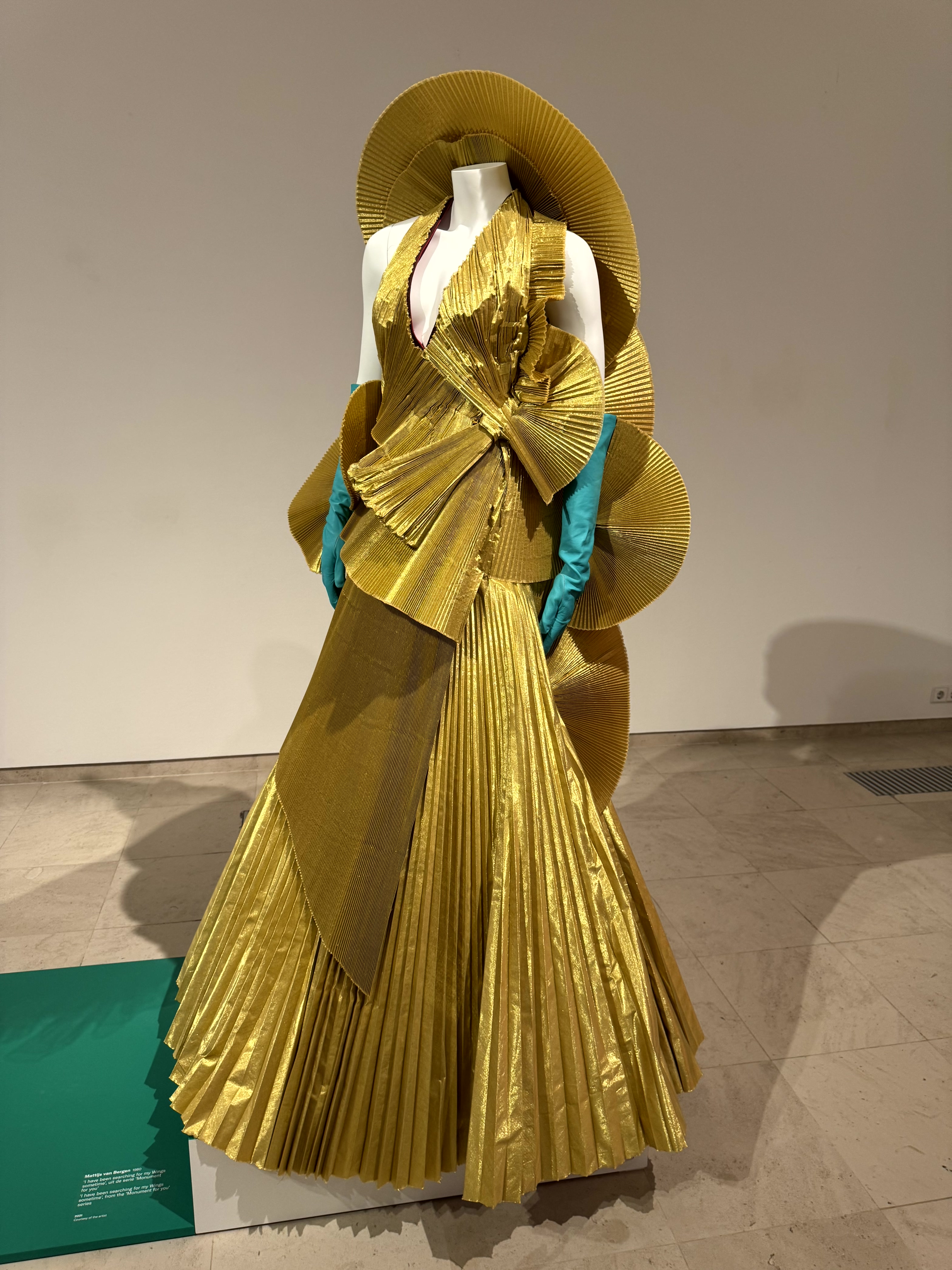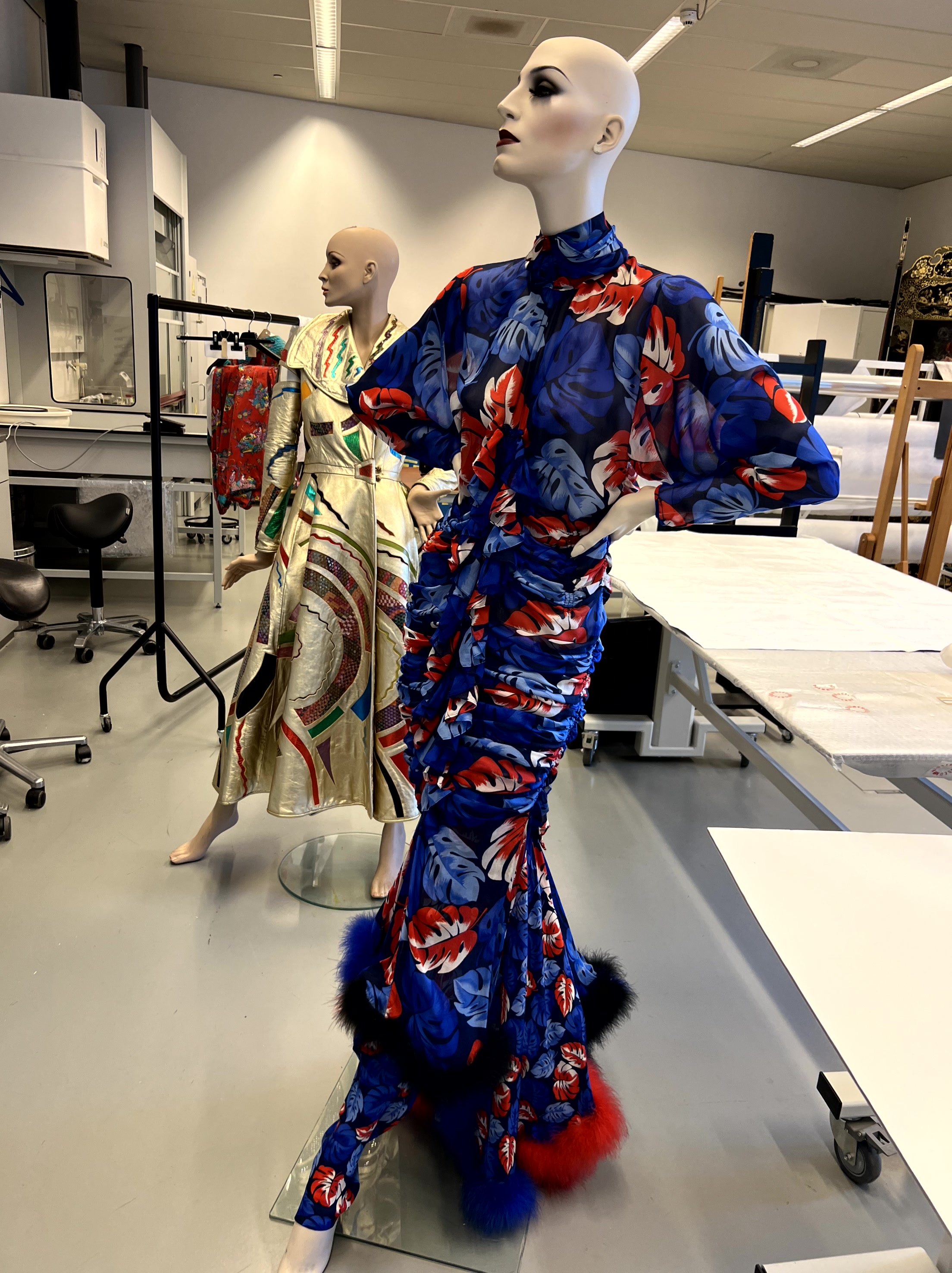 Een heerlijke, kleurrijke, theatrale tentoonstelling met werk van de nu 88-jarige modediva, naast werk van jonge Nederlandse modeontwerpers die zich hebben laten inspireren door haar extravagante creaties. Hier onder links werk van Mattijs van Bergen en rechts Ronald van der Kemp.