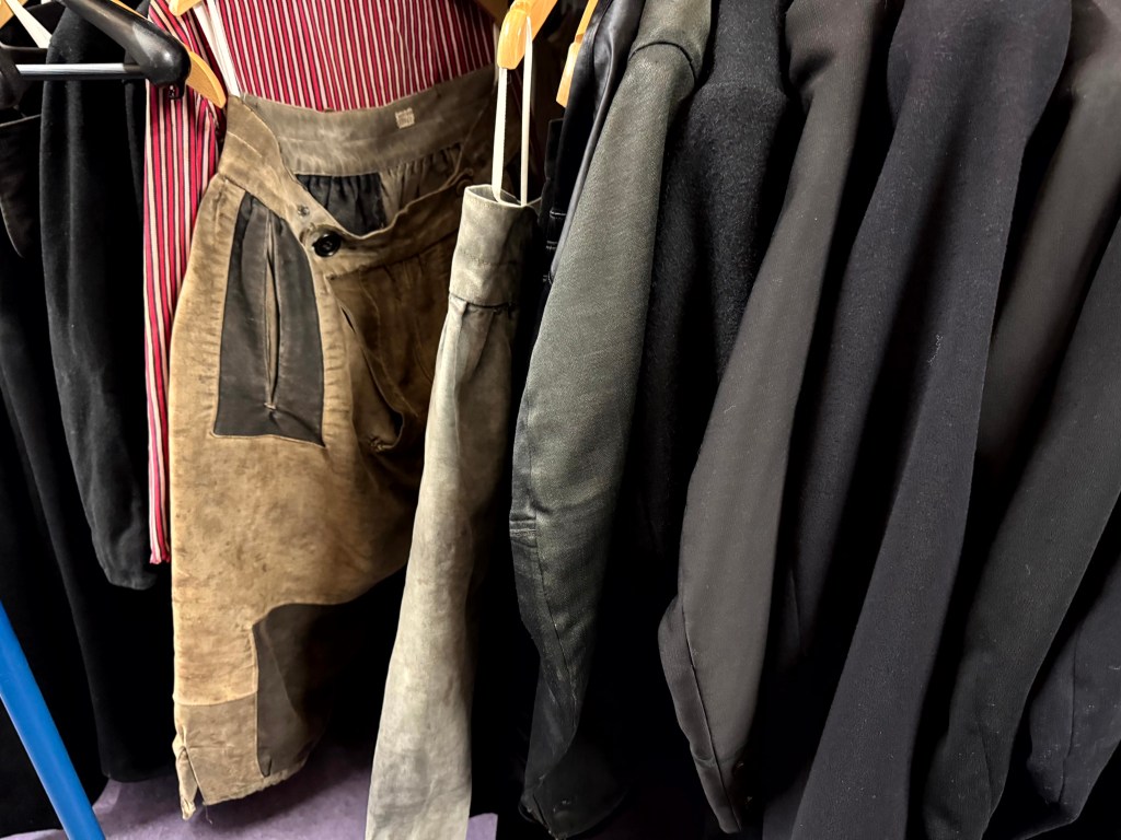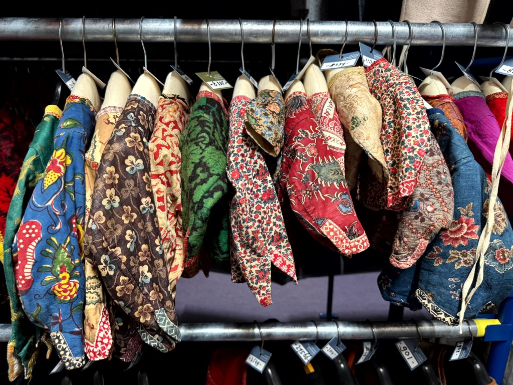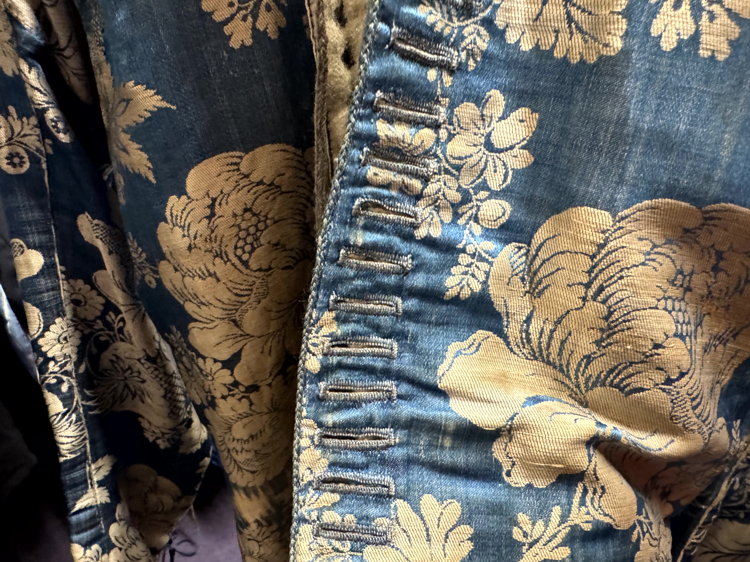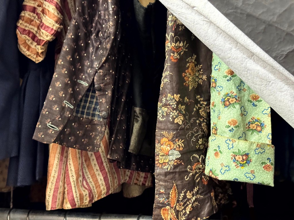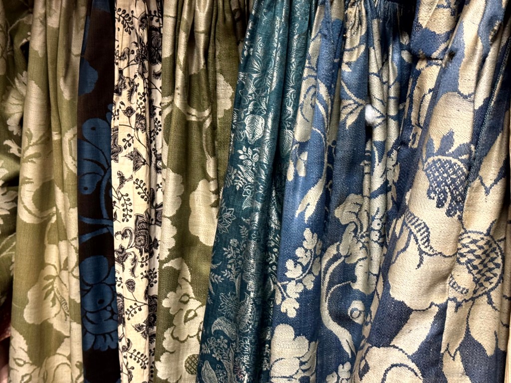 Natuurlijk hingen er in de rekken schitterende 18de-eeuwse rokken in handgeweven wollen damast met bloem- en bladmotieven. De stof werd geweven in Norwich en geëxporteerd naar onder andere Nederland.