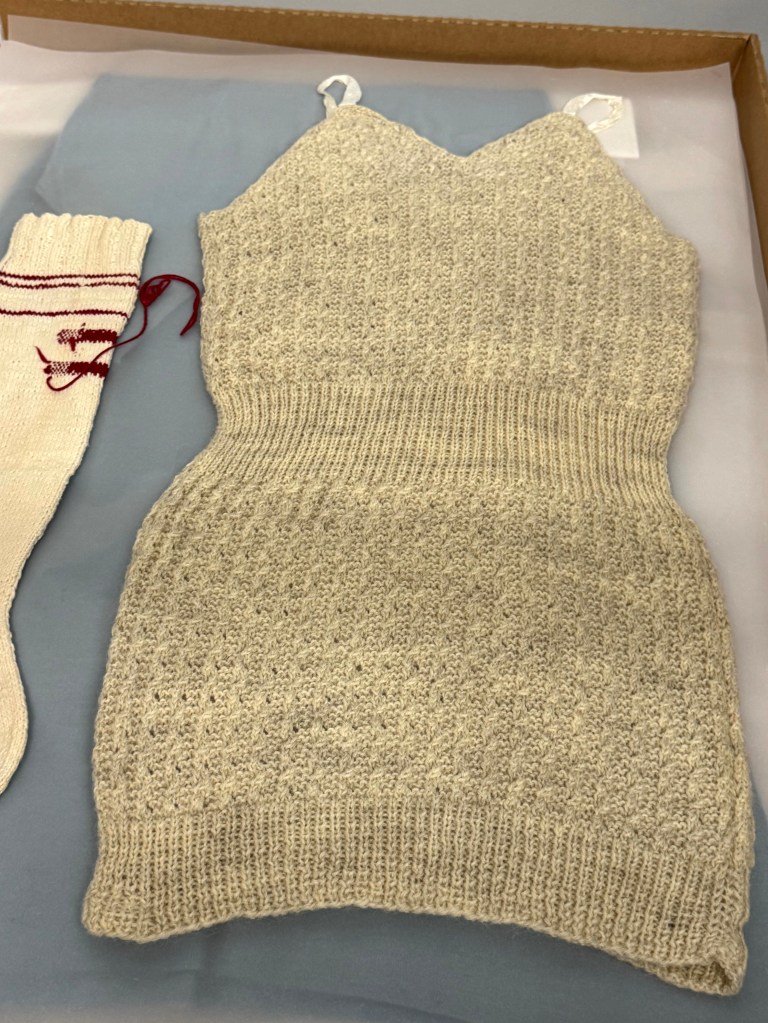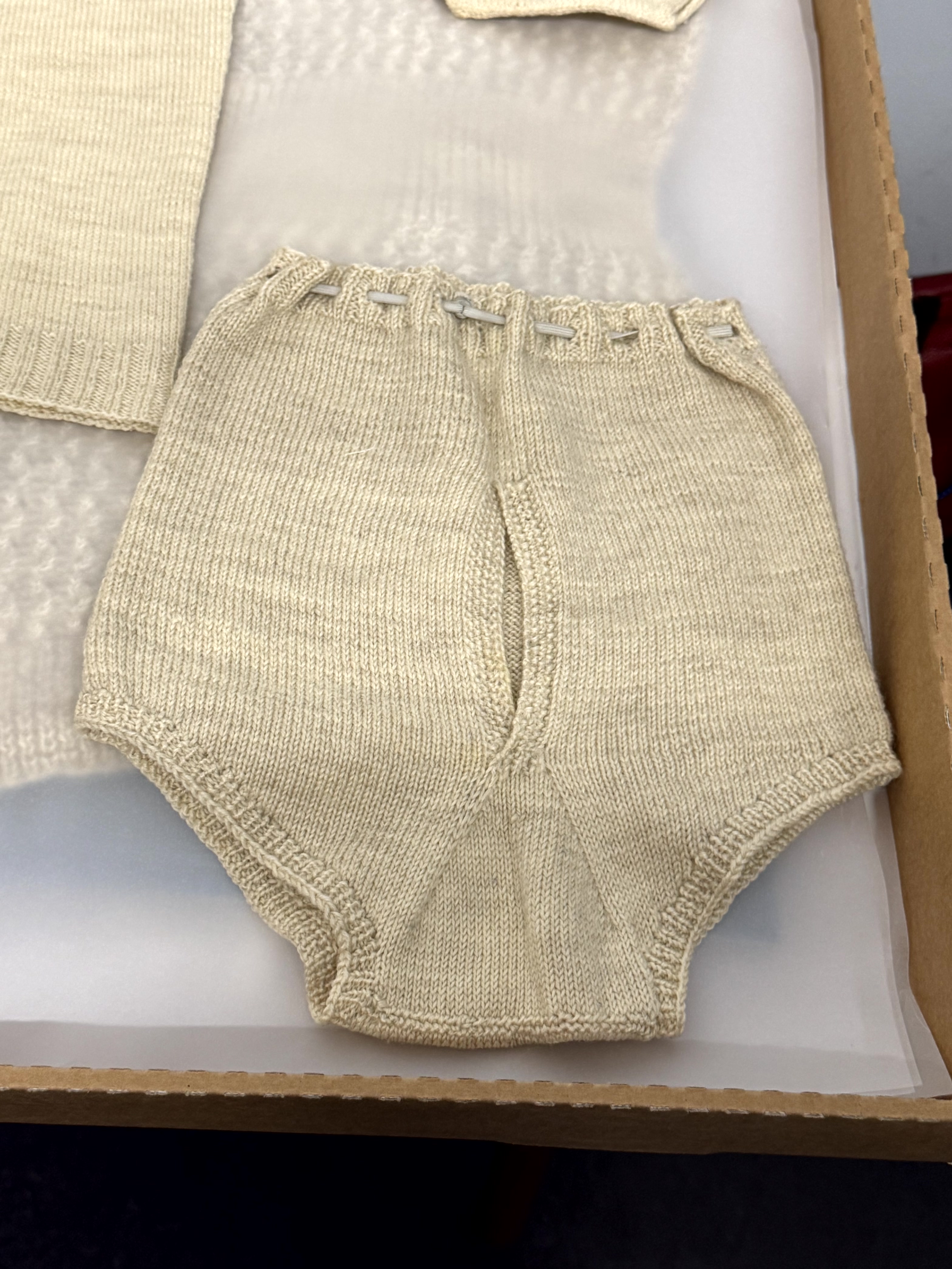 Een doos met gebreid wollen ondergoed. Ik kreeg al jeuk als ik er naar keek.