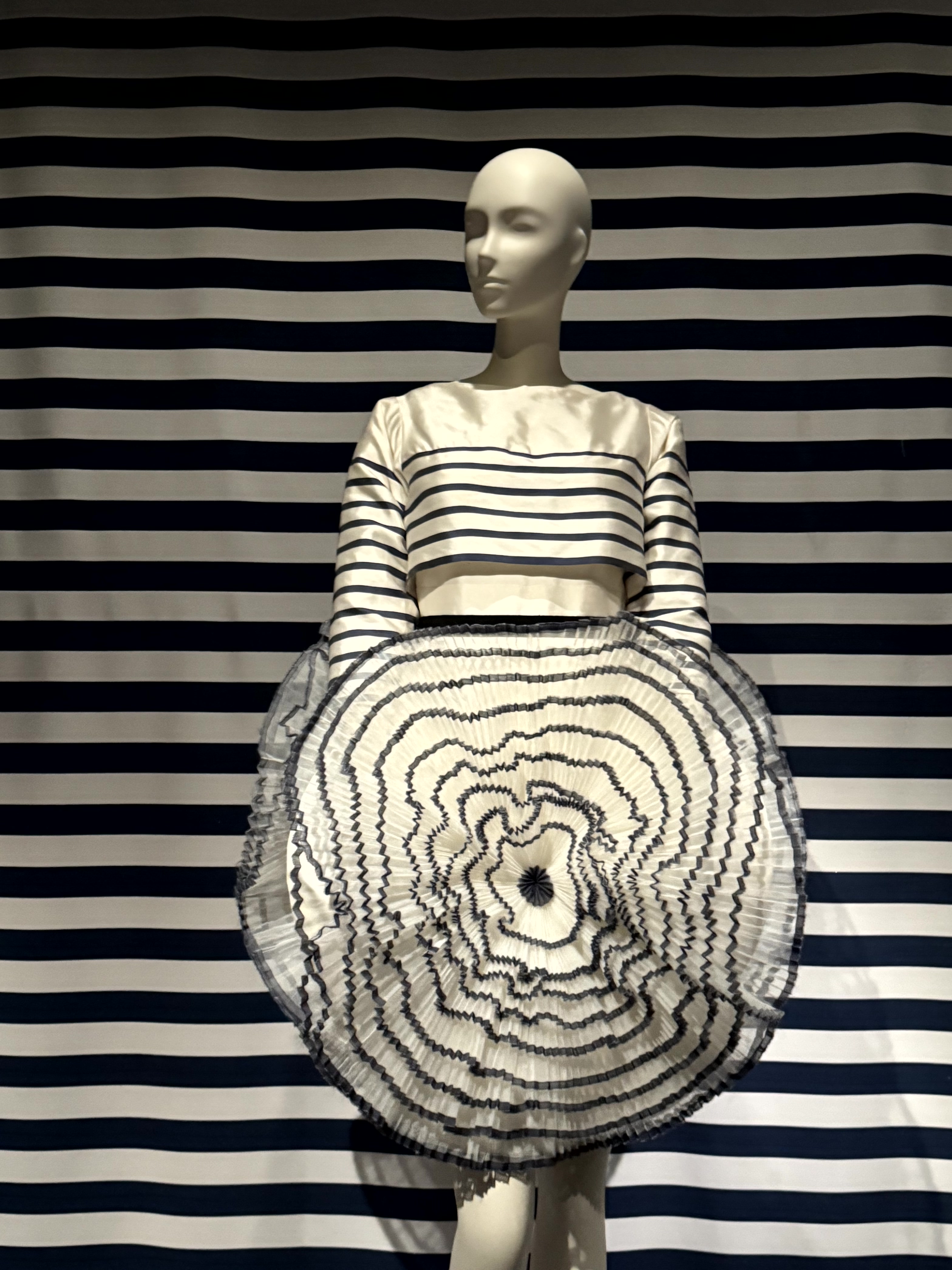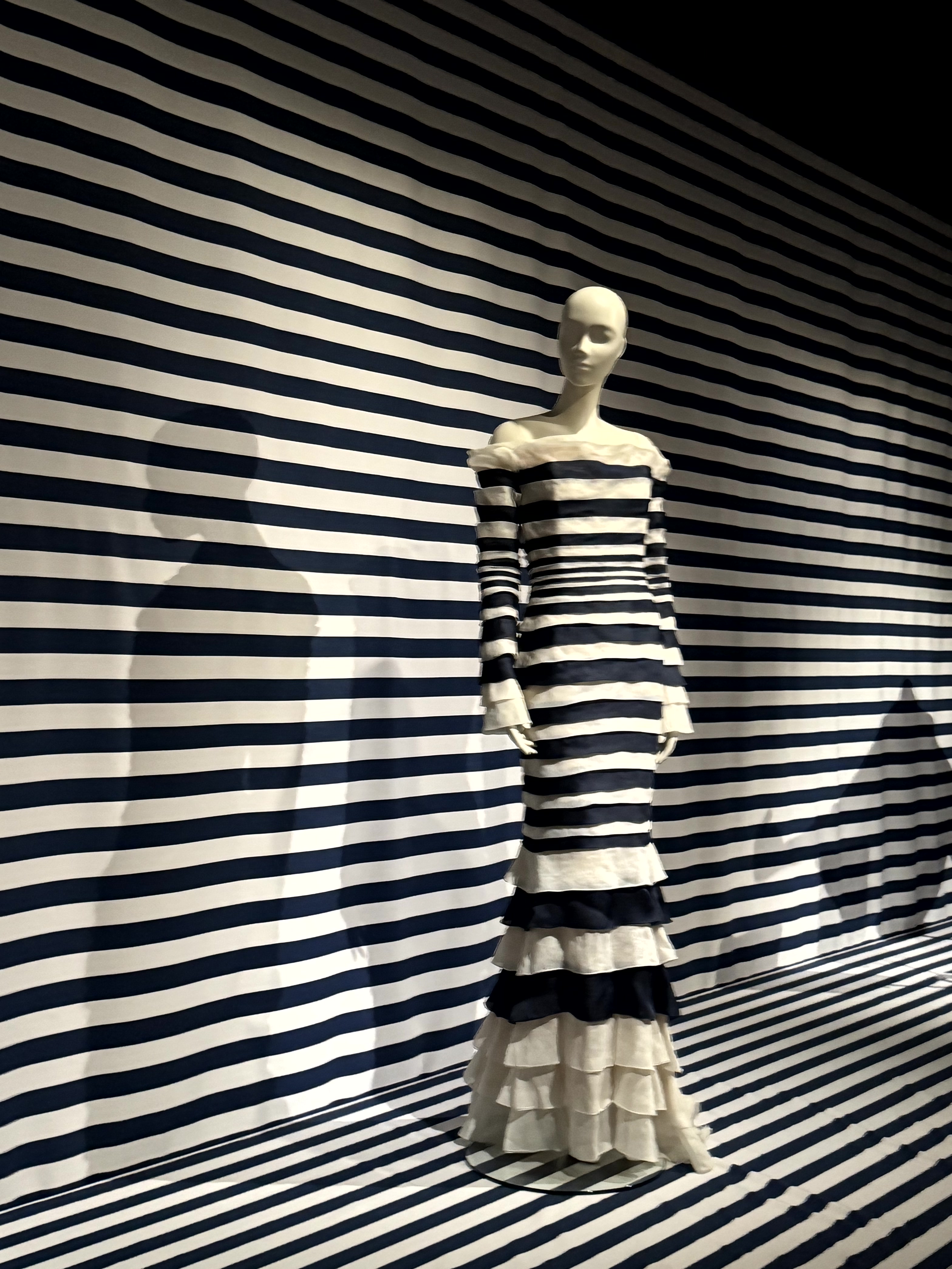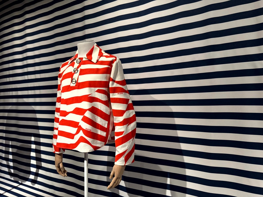 Direct in de eerste zaal was er al een groot, blauw-wit strepenfeest met kledingstukken uit verschillende collecties van Jean Paul Gaultier in de hoofdrol.