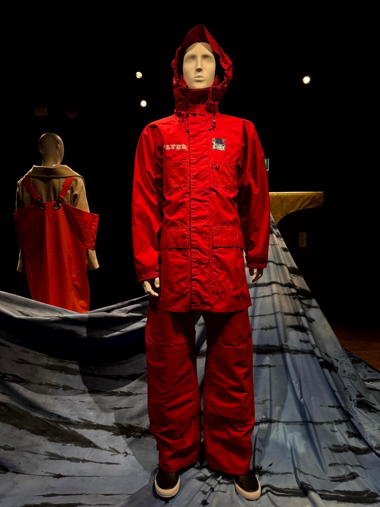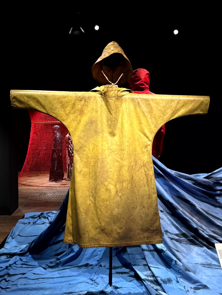 Een traditionele oliejas met zuidwester mag niet ontbreken in deze tentoonstelling. Oorspronkelijk is de jas helder geel geweest om goed op te vallen, maar door het dagelijks gebruik op het schip is de kleur wat smerig geworden.