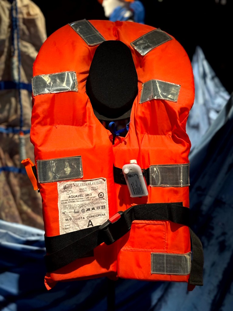 Ook onmisbaar is een reddingsvest als er nood aan de man is en het schip verlaten moet worden.