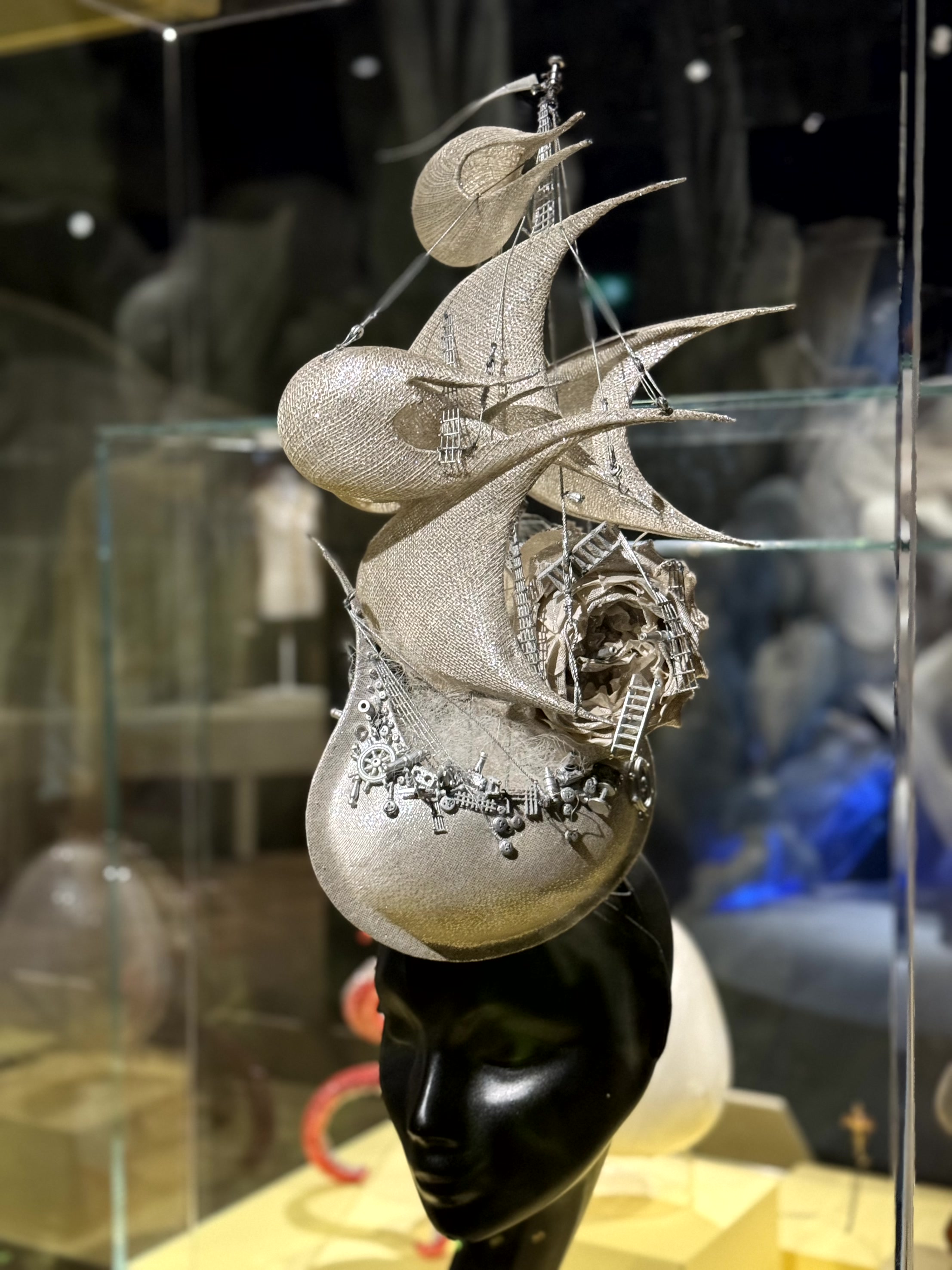 Op een etalagehoofd lijkt een boot aangemeerd te zijn. Het is een hoed van Philip Treacy die zich liet inspireren door pruiken uit de 18de eeuw.