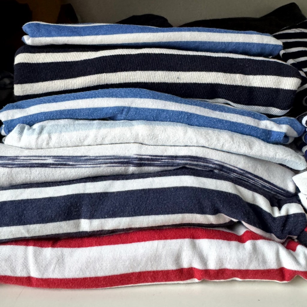 We hebben een stapel in allerlei kleuren in de kast liggen. Ik noem het altijd een democratisch kledingstuk dat gedragen wordt door mannen en vrouwen van alle leeftijden en genders. Ooit zag ik op de Albert Cuypmarkt een oma, dochter met haar man en hun twee kinderen lopen in dezelfde streep.