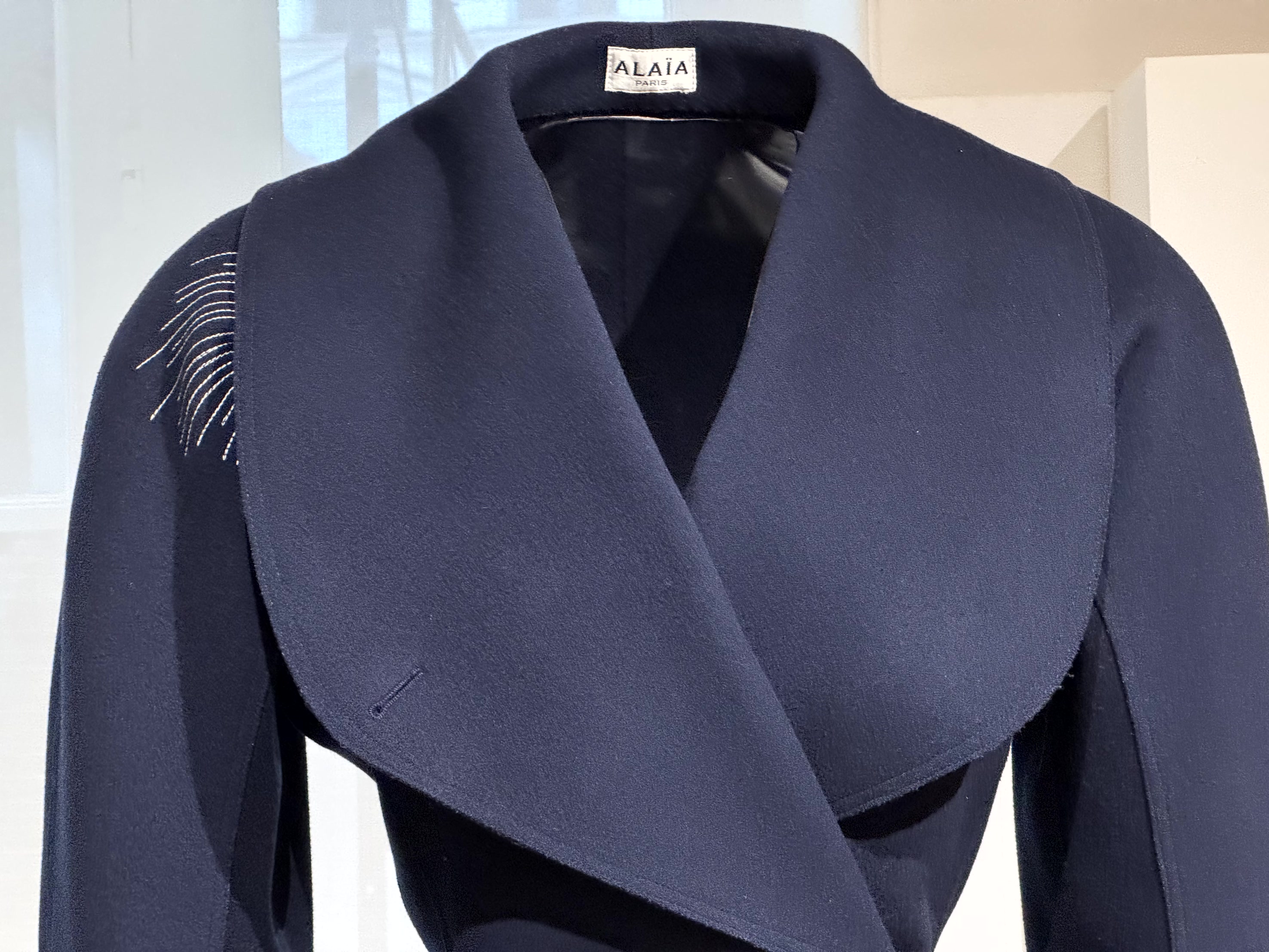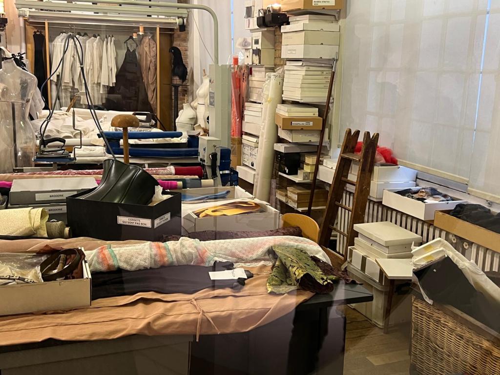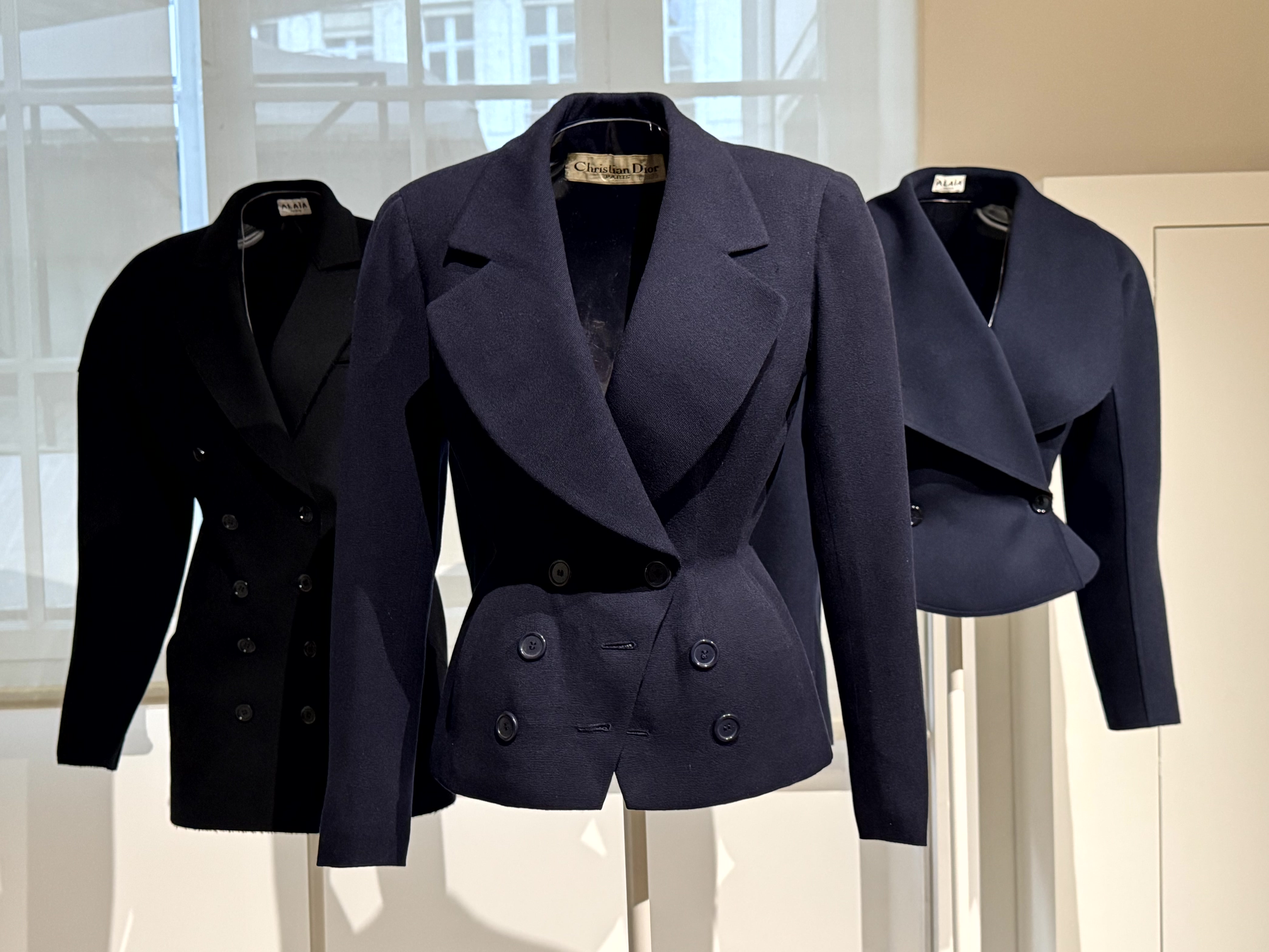 Nadat ik op de eerste etage een serie korte blauwe jasjes (middenin Dior, links en rechts Alaïa) had bewonderd, keek ik door een rond raam naar het atelier van Alaïa.