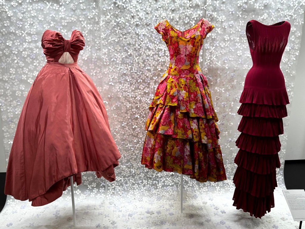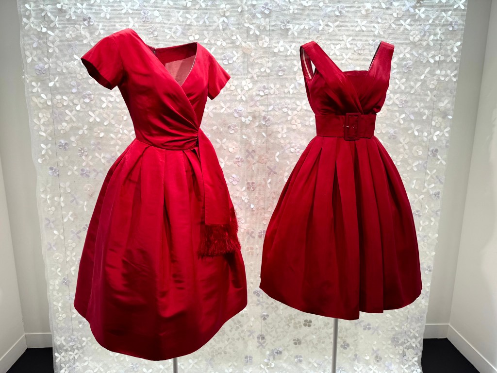 Met twee rode zijden jurken opent de tentoonstelling. Links een jurk uit 1957 van Christian Dior uit zijn Boutique collectie en rechts een couture jurk van Azzedine Alaïa uit 1958. Twee ontwerpen van meer dan een halve eeuw geleden die ook nu gedragen kunnen worden en dan voor bewondering en ophef zorgen.