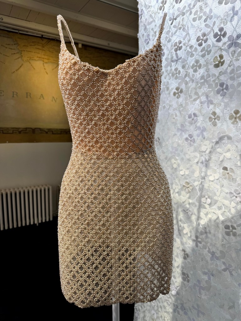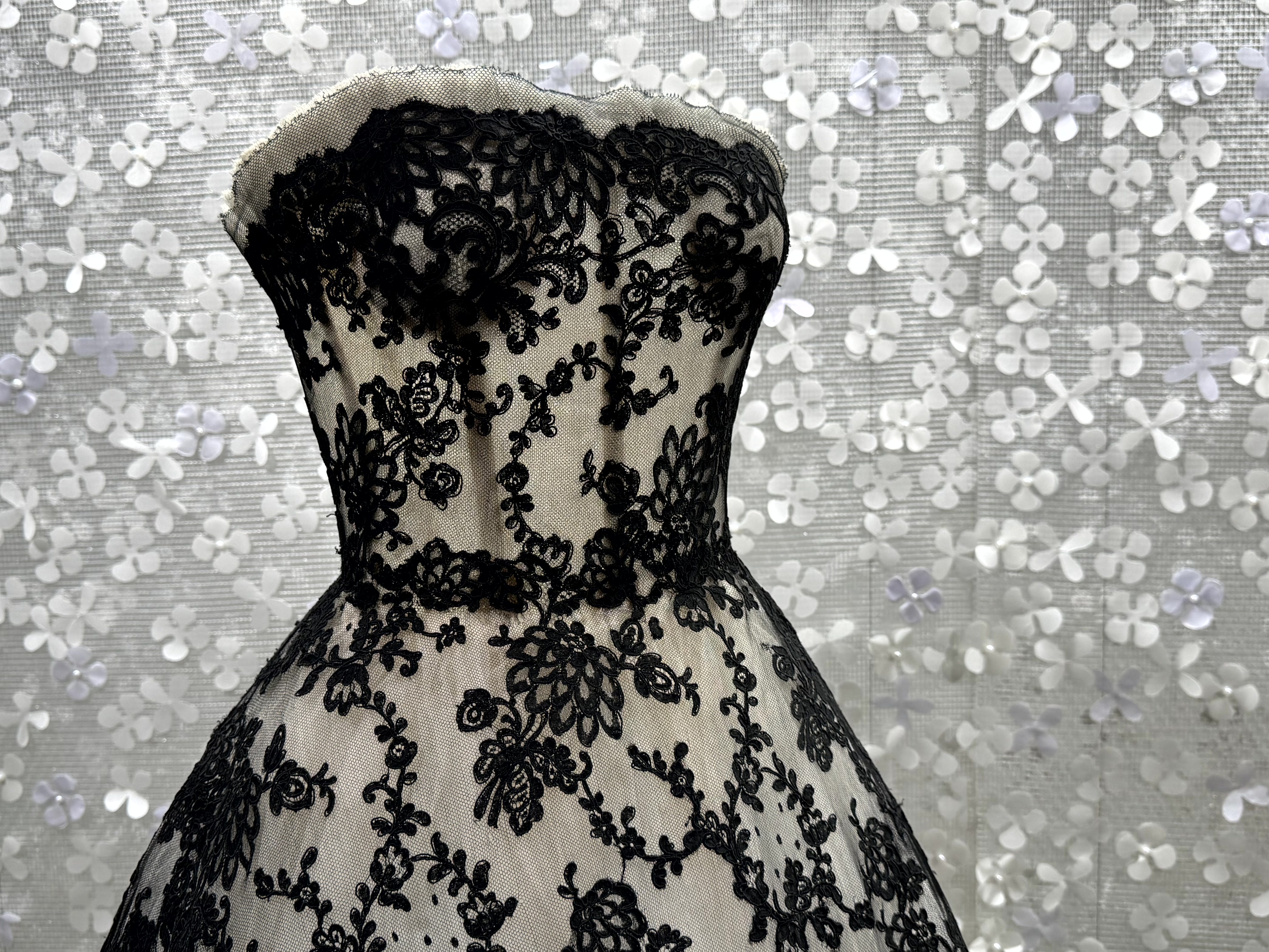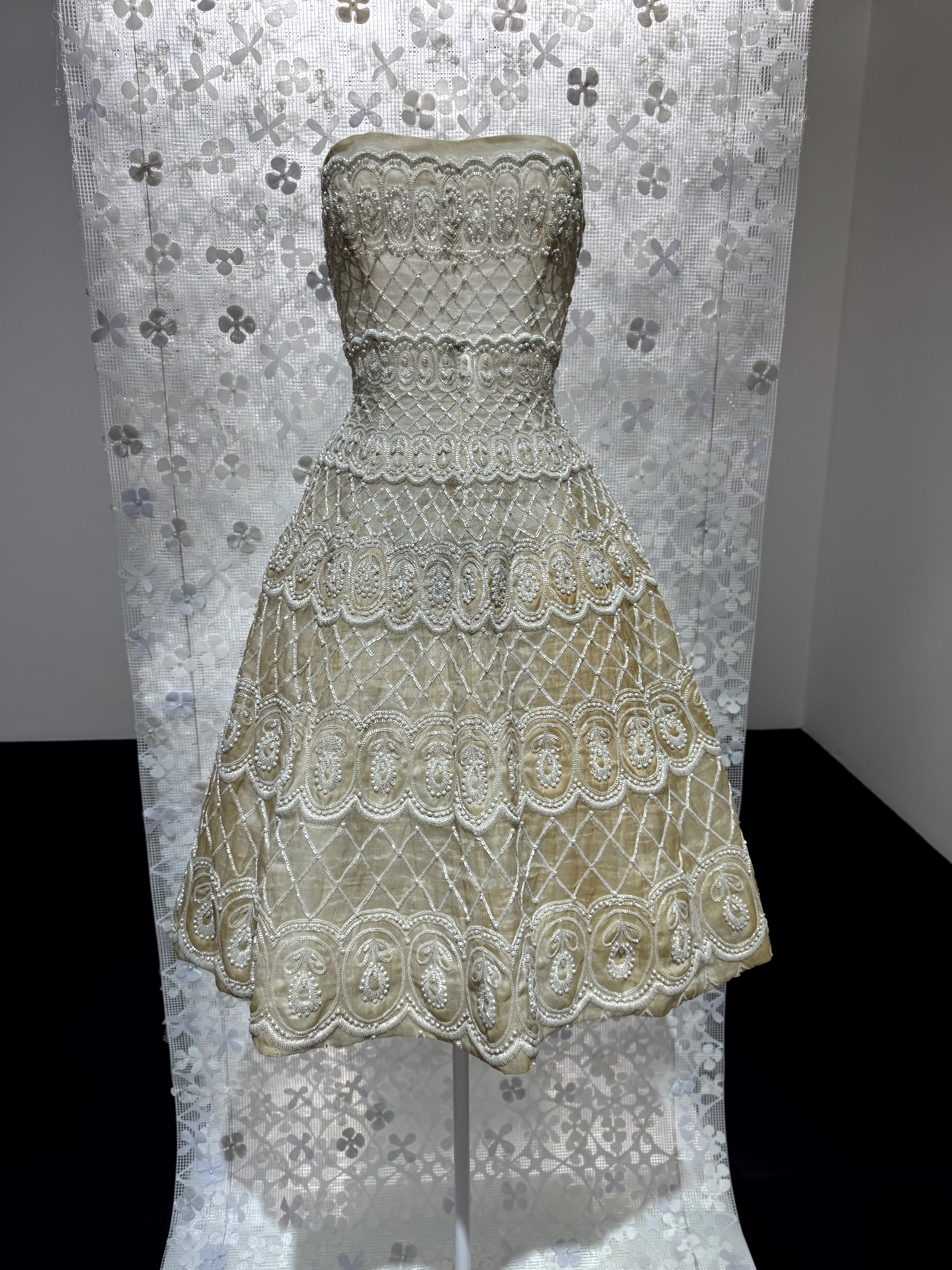 Het vakmanschap van de makers van de jurken is fenomenaal. Op de strapless jurk van Dior uit de collectie ‘Romance’ uit 1957 zijn duizenden glazen kraaltjes geborduurd.