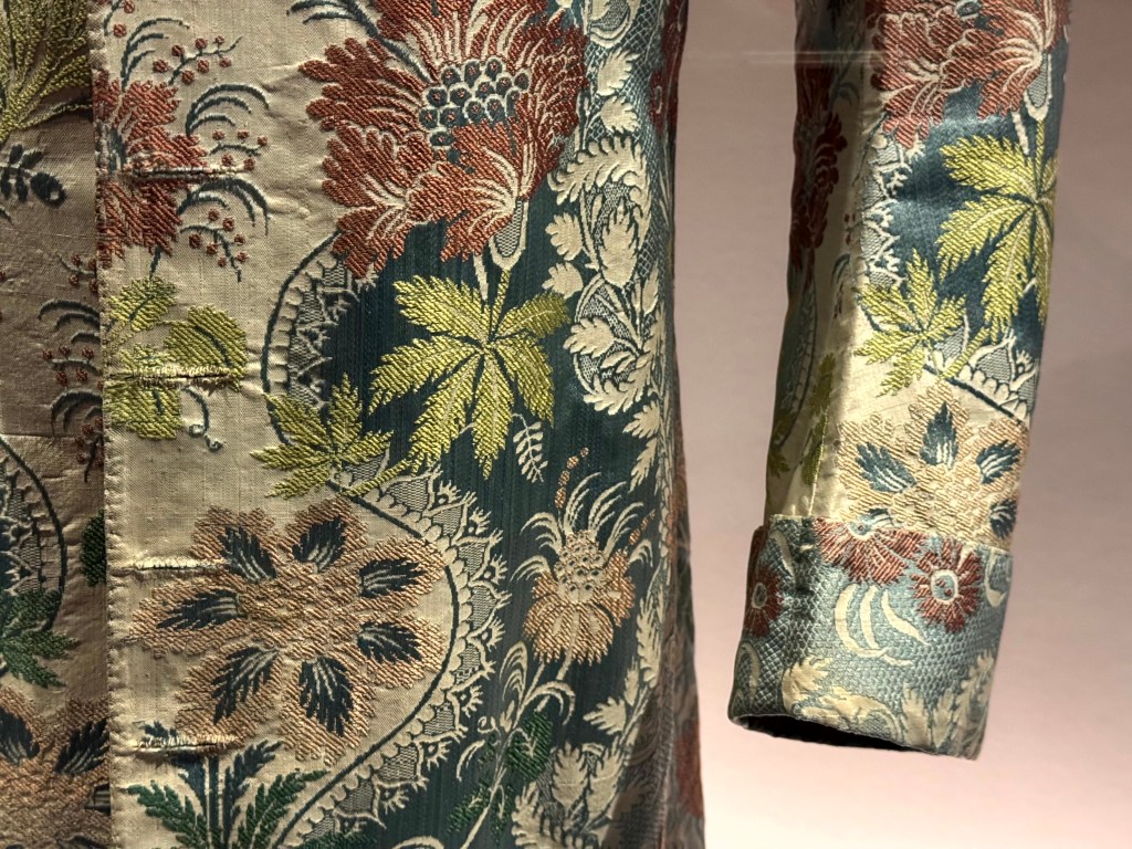 Vlak bij zijn creaties ligt een lap 18de-eeuwse zijde, geborduurd met bloemen; daar zou later een herenjasje van gemaakt worden.